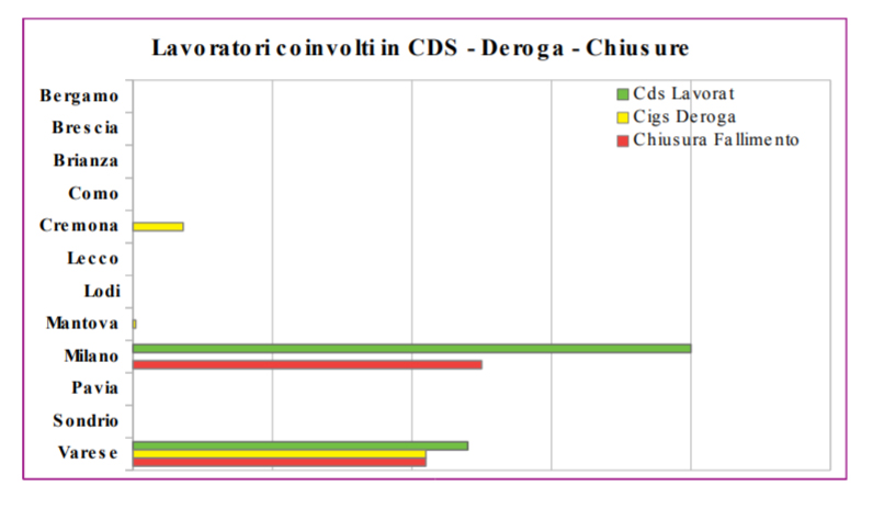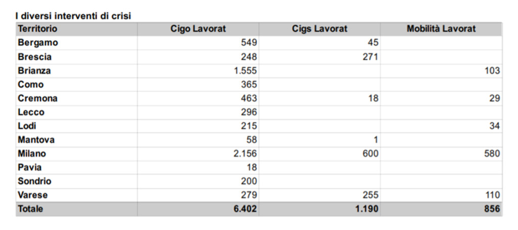 I territori maggiormente coinvolti nel ricorso alla cassa integrazione negli ultimi sei mesi sono quelli di Milano (39,49%, 159 aziende, 3.336 lavoratori), Brianza (19,63%), Varese (7,62%) e Bergamo (7,03%). Seguono Brescia e Cremona con il 6% circa e poi gli altri territori con sospensioni minori.