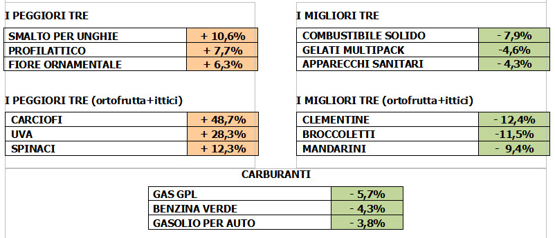 Questi i prodotti, a rilevazione locale e non centralizzata, che hanno avuto le peggiori variazioni e quelli che hanno registrato, invece, le migliori diminuzioni di prezzo rispetto al mese precedente: