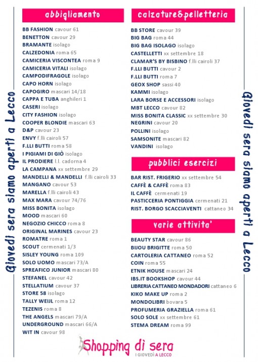 LECCO – Prenderà il via giovedì 21 giugno il tradizionale appuntamento Shopping di Sera targato Confcommercio Lecco giunto alla sua 11^ edizione. Per sei giovedì, dal 21 giugno al 26 luglio, 74 esercenti aderenti all’inizitiva divenuta ormai un appuntamento fisso, aprirannola propria attività fino alle 23.