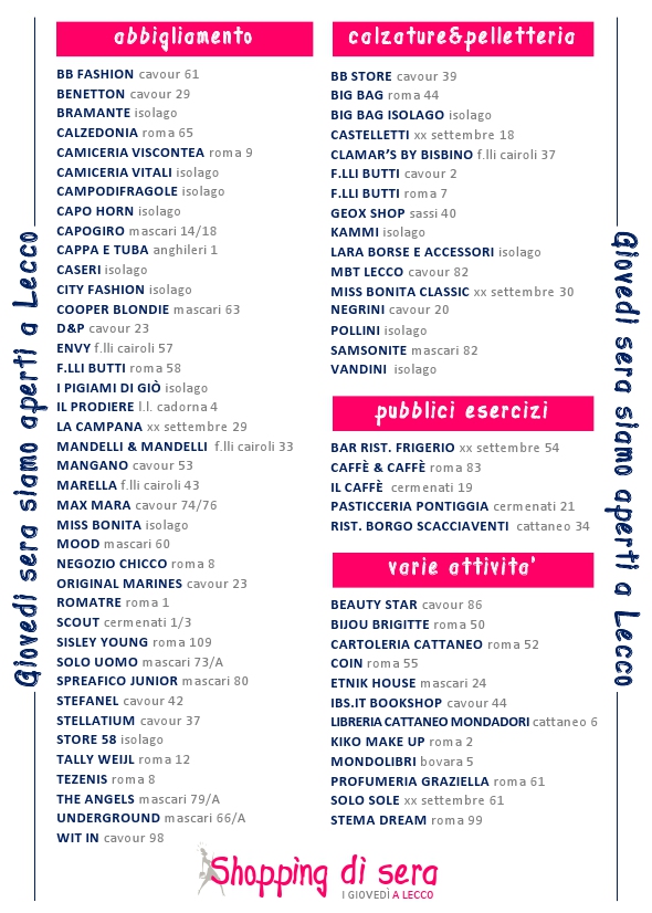 Alberto Negrini presidente Confcommercio Zona Lecco sottolinea così l’importanza dell’iniziativa quest’anno ridotta a 6 appuntamenti rispetto agli 11 dello scorso anno. “Come capita spesso a molte iniziative anche questa rischiava di inflazionarsi e perdere l’appeal sulla gente. Quindi le soluzioni erano due archiviare l’evento, oppore rilanciarlo attraverso un ricompattamento dell’iniziativa conferendole un’identità forte e rilanciandone la visibilità. Abbiamo deciso di optare per la seconda soluzione e i risultati li abbiamo avuti già prima di cominciare”. E infatti il volto nuovo di Shopping di Sera lo si nota già dalle locandine e dai volantini che sono in distribuzioni.