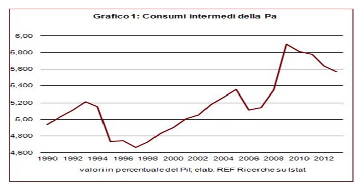 Circa 7 miliardi (a regime nel 2016, di cui 0.8 nel 2014, 1.5 nel 2015 e quasi 5 nel 2016) dovrebbero derivare dalla contrazione della spesa per acquisti di beni e servizi, attraverso un maggiore ricorso alle convenzioni Consip. La Consip e la centralizzazione degli acquisti delle Ap non sono però un’invenzione recente. L’avvio del programma di “razionalizzazione” degli acquisti della Pa risale alla fine degli anni ‘90, ma una vera contrazione della spesa per consumi pubblici si è osservata solo a partire dal 2010, anno di inizio delle manovre “lacrime e sangue”. La prudenza indurrebbe quindi a considerare con cautela i risparmi stimati da queste misure.