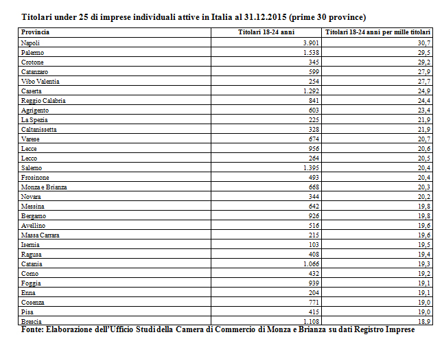 A Napoli, seguita da Palermo e da Crotone, si registra il più alto indice di incidenza delle imprese dei “giovanissimi”, qui ogni 1000 titolari circa 30 hanno un’età compresa tra i 18 e i 24 anni. Tra i primi 20 posti troviamo anche 4 realtà lombarde: Varese, Lecco, Monza e Brianza e Bergamo, con un indice che va da 20,7 (ogni mille ditte individuali) a 19,8.
