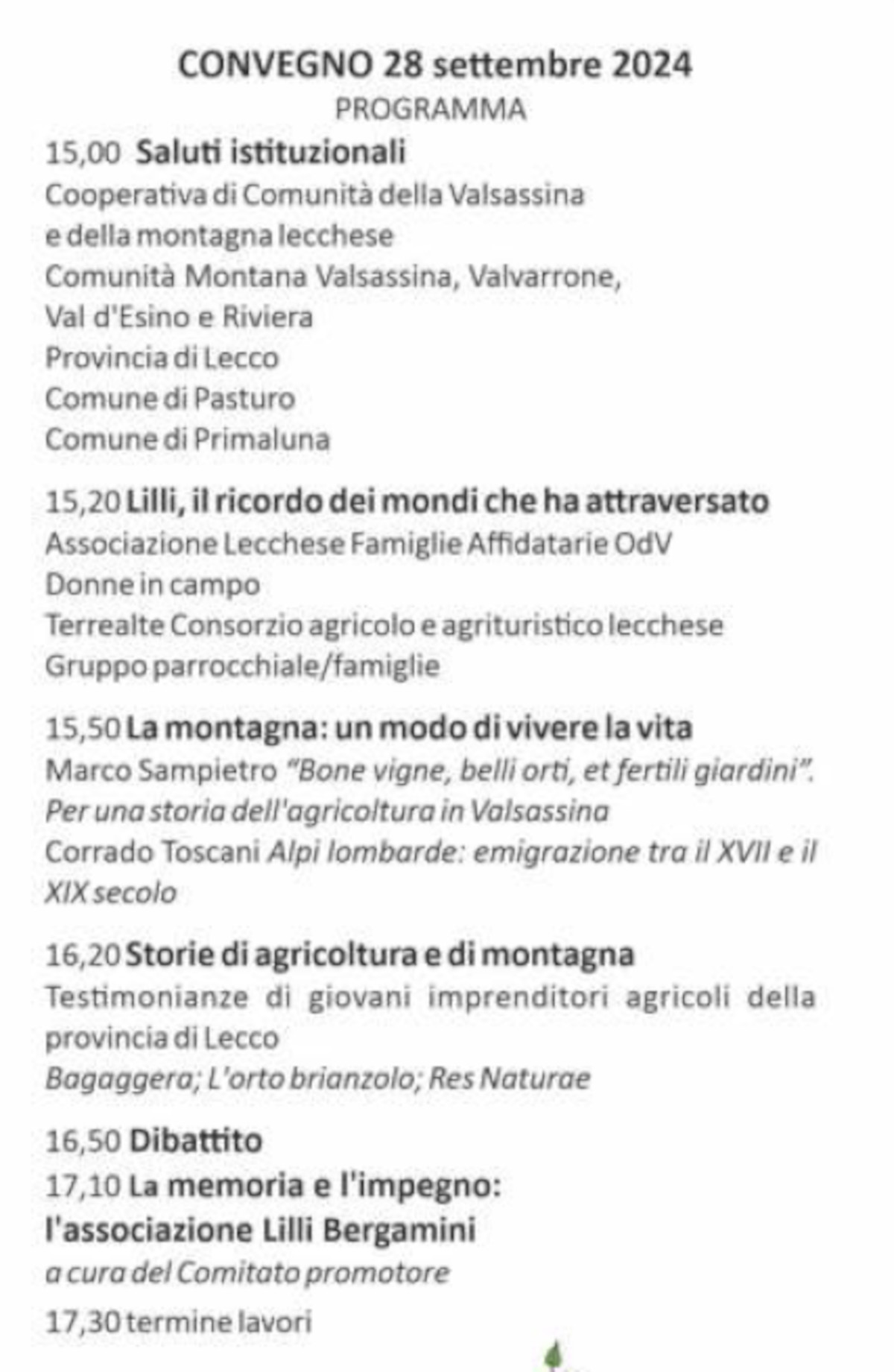PRIMALUNA – Un evento per celebrare la memoria di Liliana Bergamini e il suo amore per la montagna e l’agricoltura. È questo il cuore del convegno “Lilli Bergamini, una montagna di vita – Impegno e passione per l’umanità, la natura e la montagna” organizzato dal comitato promotore dell’Associazione Lilli Bergamini, in collaborazione con Terrealte Consorzio agricolo e agrituristico lecchese, l’Associazione Lecchese Famiglie Affidatarie OdV, Donne in Campo e gli amici di Lilli.