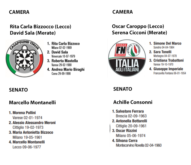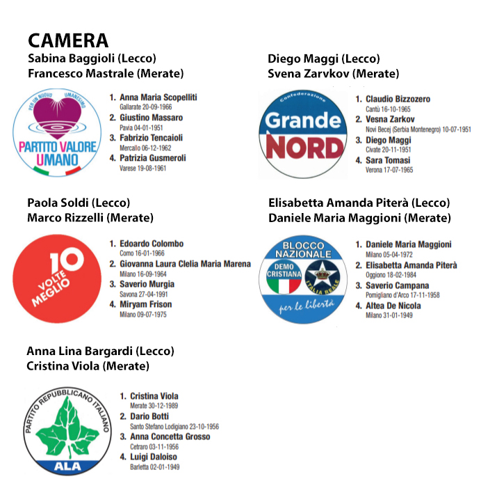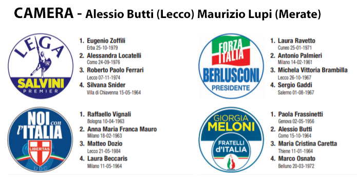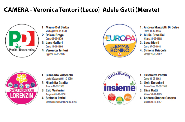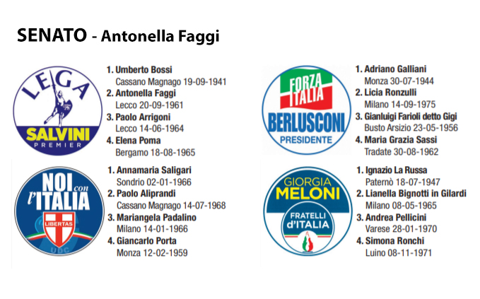 Elezioni 2018Politica Elezioni Politiche 2018 – Tutti i candidati Di Andrea Brivio - 02/03/2018 Facebook Twitter WhatsApp Linkedin Email Telegram Tempo di lettura: 2 minuti I CANDIDATI PER LE ELEZIONI POLITICHE COALIZIONE CENTROSINISTRA [clear-line] COALIZIONE CENTRO DESTRA [clear-line] SOLO PER LA CAMERA DEI DEPUTATI