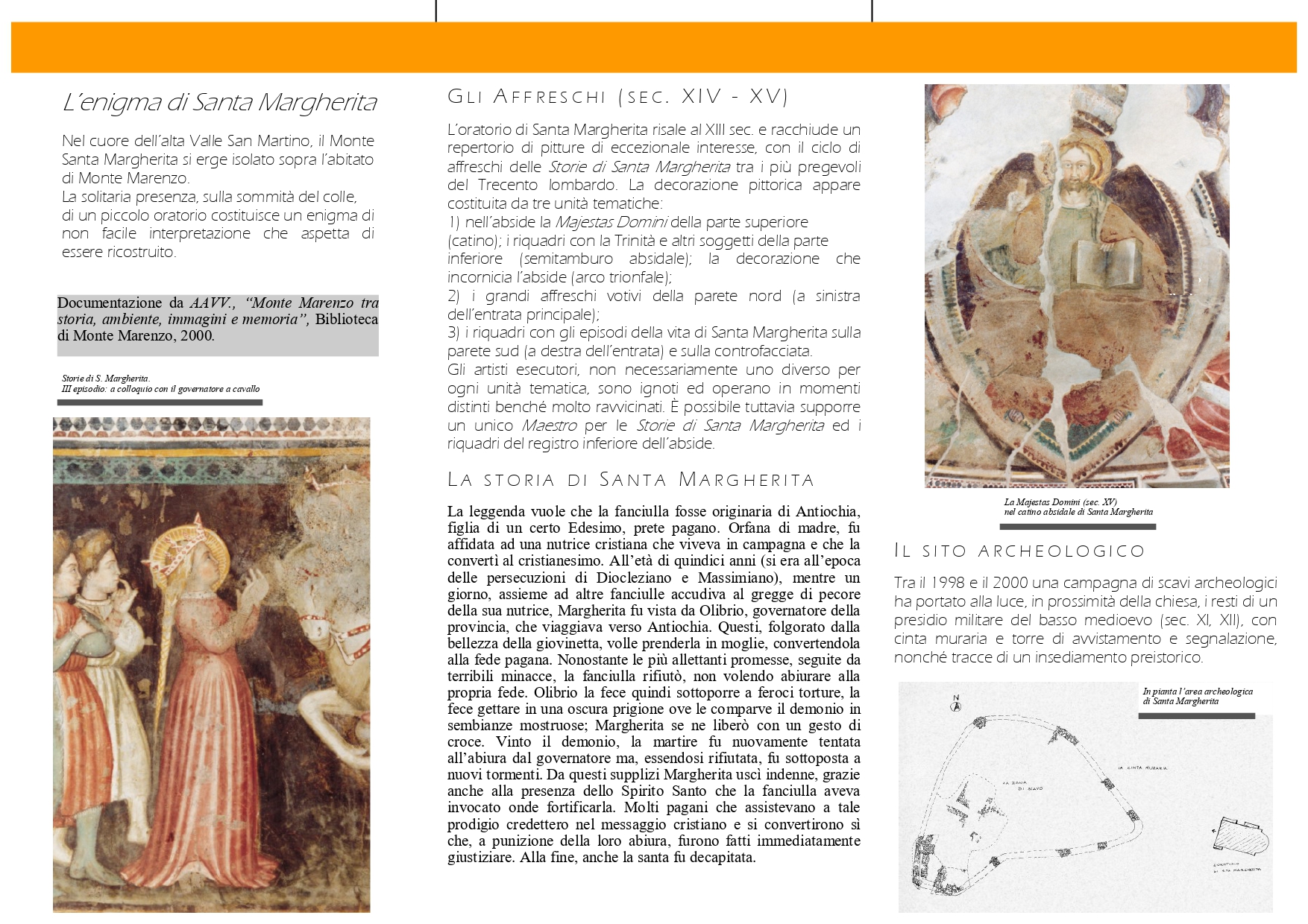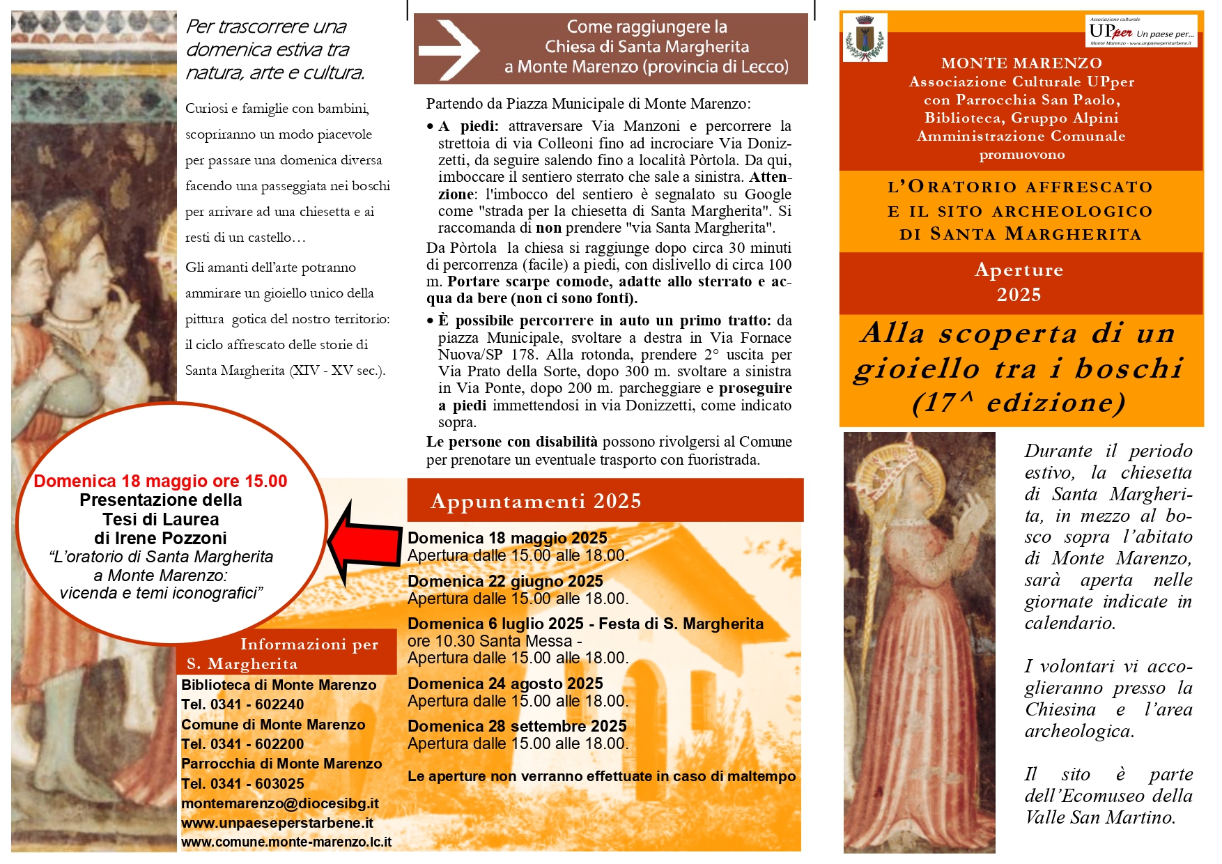L’Oratorio di Santa Margherita a Monte Marenzo si prepara ad accogliere la 16° edizione di “Alla scoperta di un gioiello tra i boschi“. Nel cuore dell’alta Valle San Martino, il Monte Santa Margherita si erge isolato sopra l’abitato di Monte Marenzo. La solitaria presenza, sulla sommità del colle, di un piccolo oratorio costituisce un enigma di non facile interpretazione che aspetta di essere ricostruito. Curiosi e famiglie con bambini, scopriranno un modo piacevole per passare una domenica diversa facendo una passeggiata nei boschi per arrivare ad una chiesetta e ai resti di un castello. Gli amanti dell’arte potranno ammirare un gioiello unico della pittura gotica del nostro territorio: il ciclo affrescato delle storie di Santa Margherita risalente al XIV – XV secolo.