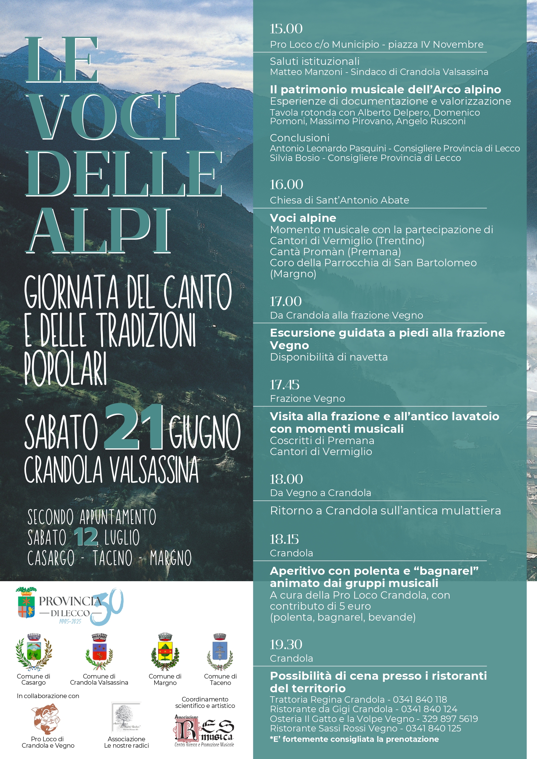 L’evento di lancio, in programma Sabato 21 Giugno dalle 15.00 a Crandola, si aprirà con un momento di dialogo e riflessione su uno dei più importanti patrimoni dell’arco alpino: il canto. Le caratteristiche del canto tradizionale delle Alpi e delle Prealpi saranno illustrate in una tavola rotonda con rappresentanti istituzionali, studiosi e cantori di varie realtà geografiche.