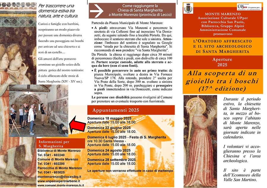 L’iniziativa, promossa dall’associazione culturale UPper con la collaborazione ed il patrocinio di Parrocchia San Paolo, Amministrazione Comunale, Biblioteca e Gruppo Alpini di Monte Marenzo, propone, durante il periodo estivo, aperture della Chiesetta di Santa Margherita, a cura di volontari.