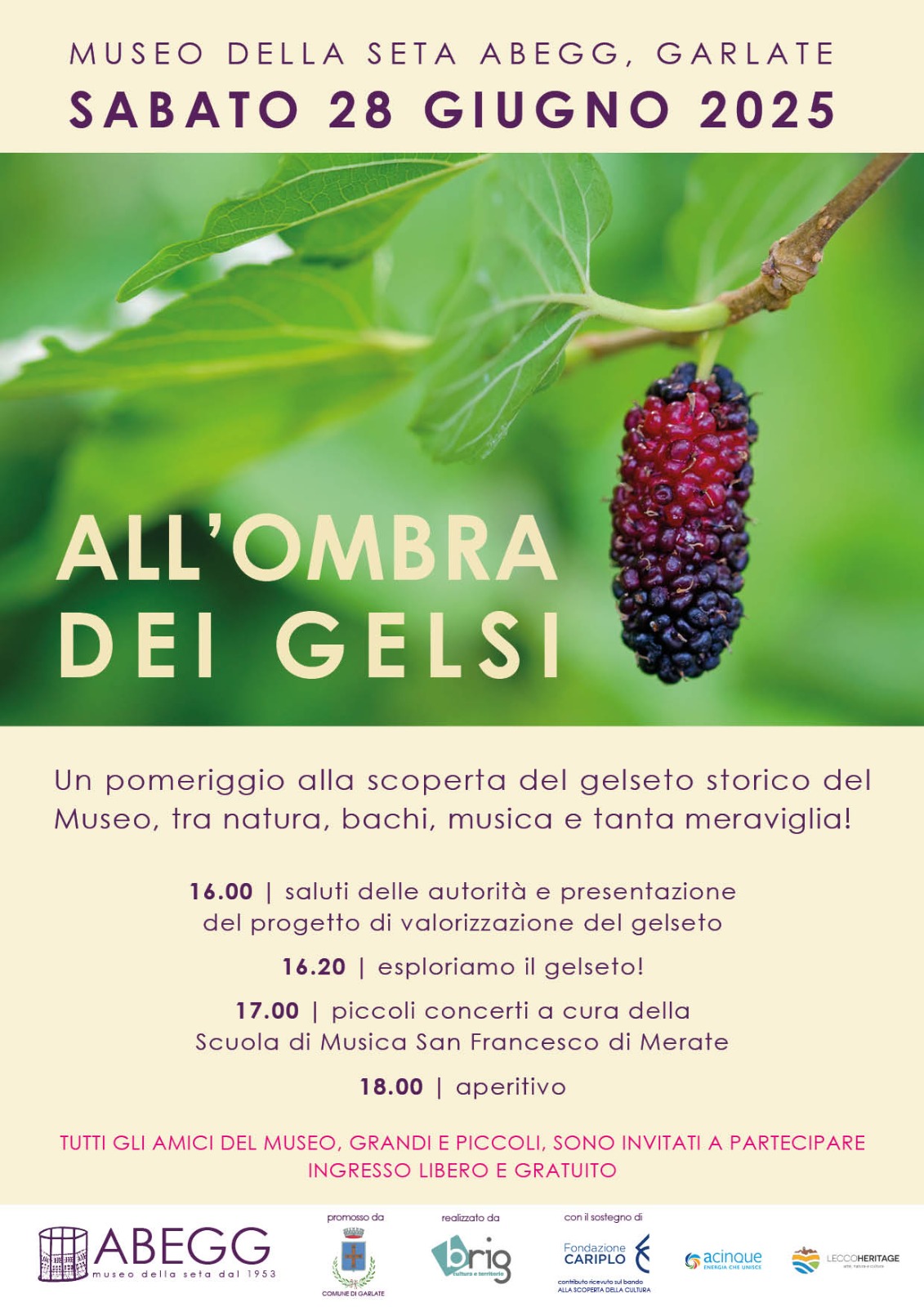 “All’ombra dei gelsi”, è titolo dell’evento organizzato dal Museo della Seta Abegg di Garlate e Brig-Cultura e Territorio per Sabato 28 Giugno, dalle 16.00. L’allestimento si concentra sulla storia e l’uso del baco da seta nel territorio lecchese. Alle 18.00 il pomeriggio si concluderà con un aperitivo.
