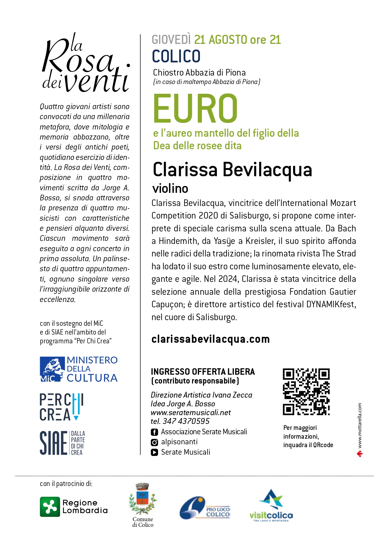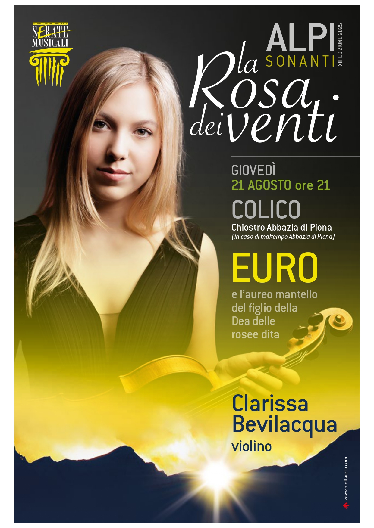 Giovedì 21 Agosto alle 21.00 presso il chiostro dell’Abbazia di Piona, a Colico si terrà l’evento di Alpi Sonanti dal titolo La Rosa dei Venti con la violinista Clarissa Bevilacqua. L’ingresso è libero con un contributo a piacere. In caso di maltempo l’evento si svolgerà all’interno dell’Abbazia.
