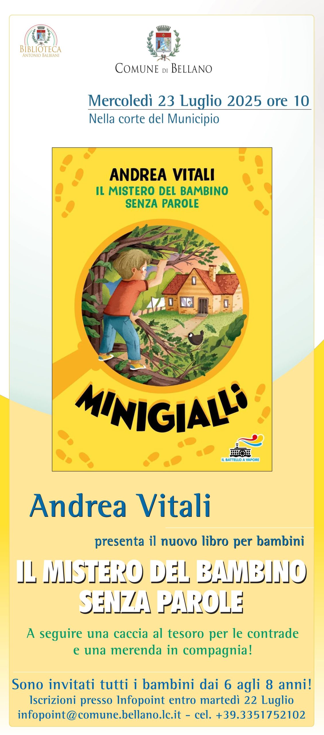 Mercoledì 23 Luglio alle 10.00 Andrea Vitali presenterà a Bellano, presso la Corte del Municipio il nuovo libro per bambini “Il mistero del bambino senza parole”. La partecipazione è gratuita previa prenotazione entro Martedì 22 Luglio alla email infopoint@comune.bellano.lc.it o ai numeri 335 1752102 / 0341 1570370