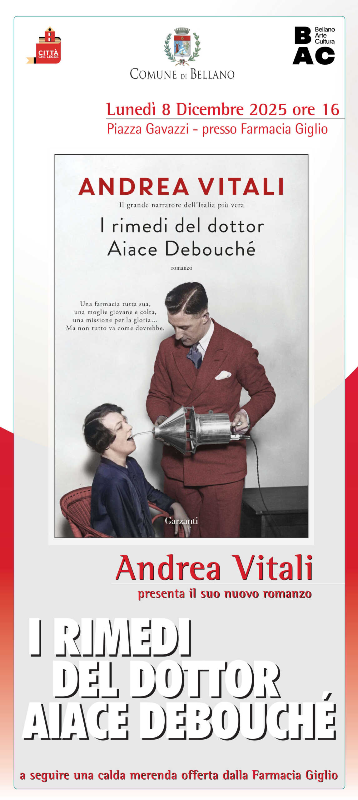 Lunedì 8 Dicembre alle 16.00, lo scrittore Andrea Vitali presenta il suo nuovo libro I rimedi del dottor Aiace Debouchè in Piazza Gavazzi, presso la Farmacia Giglio, a Bellano.