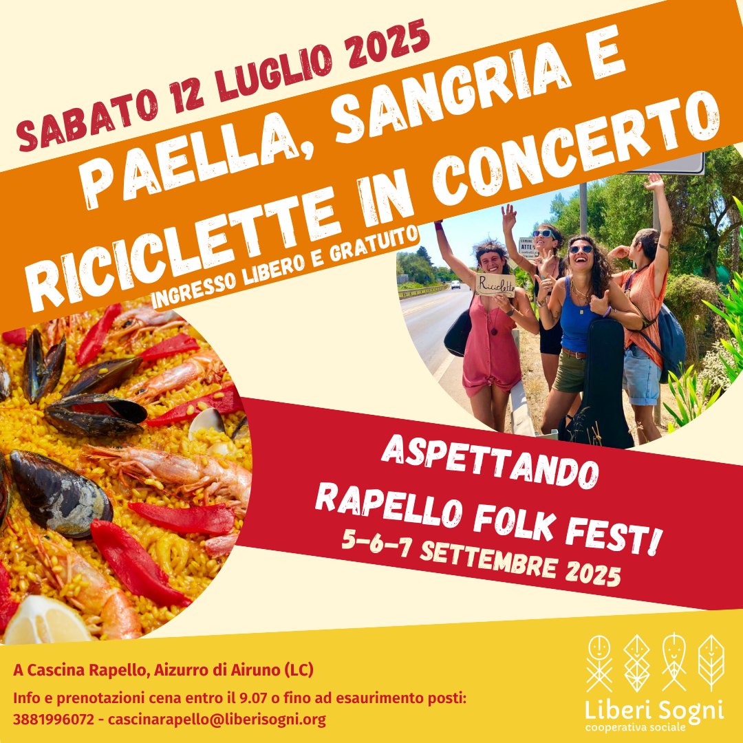 Una serata imperdibile si prospetta a Cascina Rapello, ad Aizurro di Airuno, per Sabato 12 Luglio: anche quest’anno torna l’evento della Coop Soc Liberi Sogni dedicato alla paella, accompagnato da un concerto gratuito delle Riciclette. Un piccolo assaggio di quella che sarà la quinta edizione di Rapello Folk, il festival musicale immerso nella nel verde che si terrà sempre a Cascina Rapello alla fine dell’estate: il 5, 6 e 7 settembre 2025.