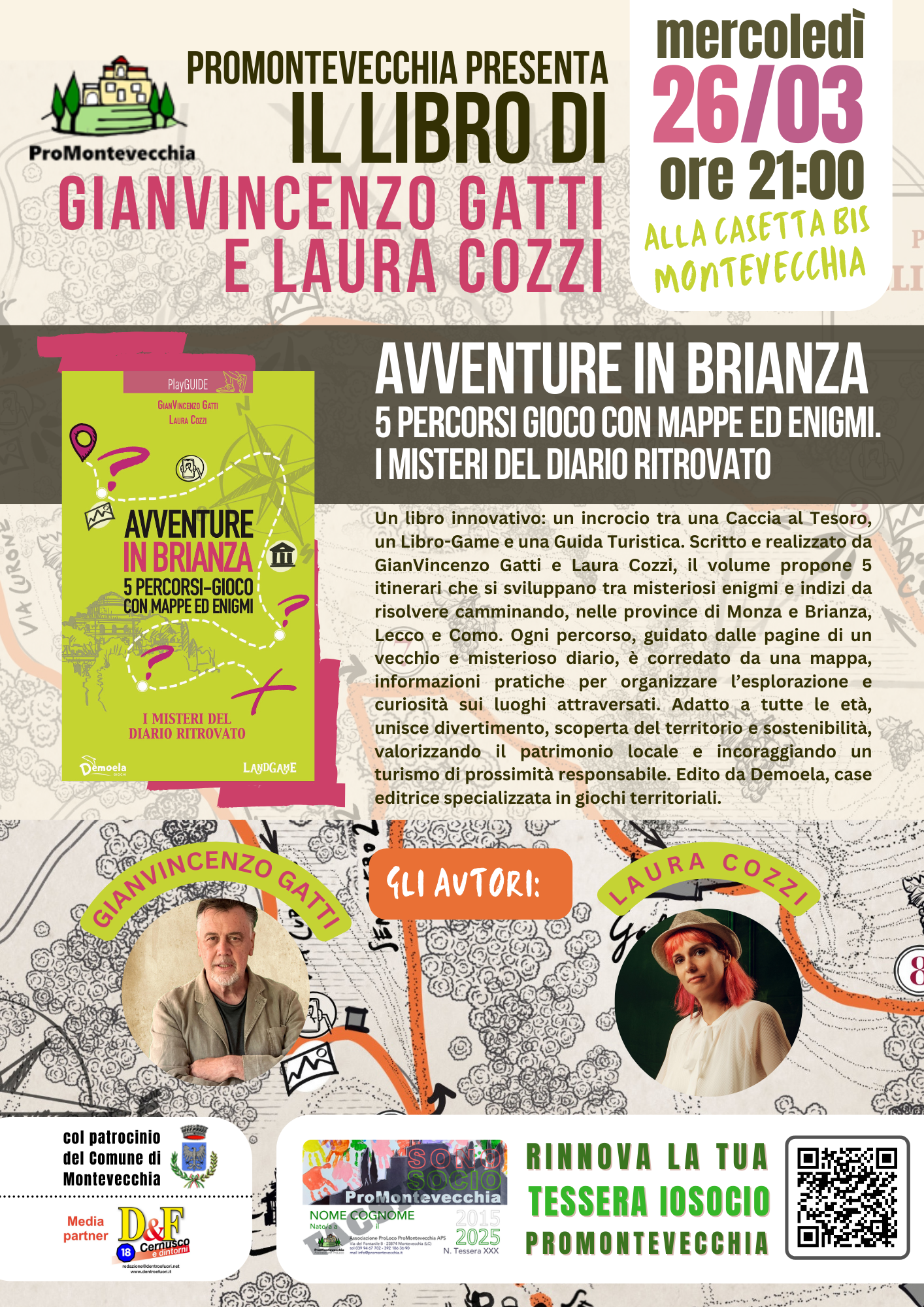 Mercoledì 26 Marzo alle 21.00, presso Casetta BIS a Montevecchia si terrà la presentazione di “Avventure in Brianza: 5 percorsi gioco con mappe ed enigmi. I Misteri del Diario Ritrovato”, un libro di GianVincenzo Gatti e Laura Cozzi. L’evento gratuito aperto a tutti.