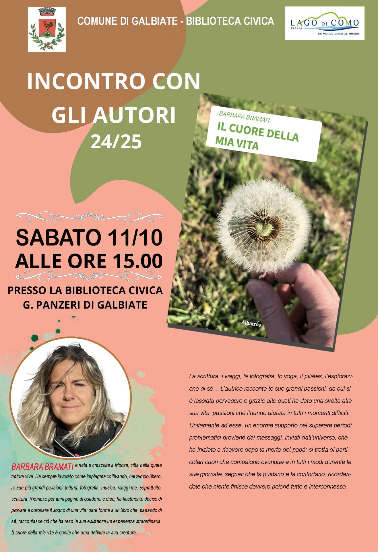 Prosegue il ciclo Incontro con gli autori presso la Biblioteca Civica G. Panzeri di Galbiate. Il secondo incontro della terza edizione è in programma per Sabato 11 Ottobre, alle 15.00, e vedrà l’autrice Barbara Bramanti presentare il suo libro Il cuore della mia vita. L’ingresso è libero e gratuito.