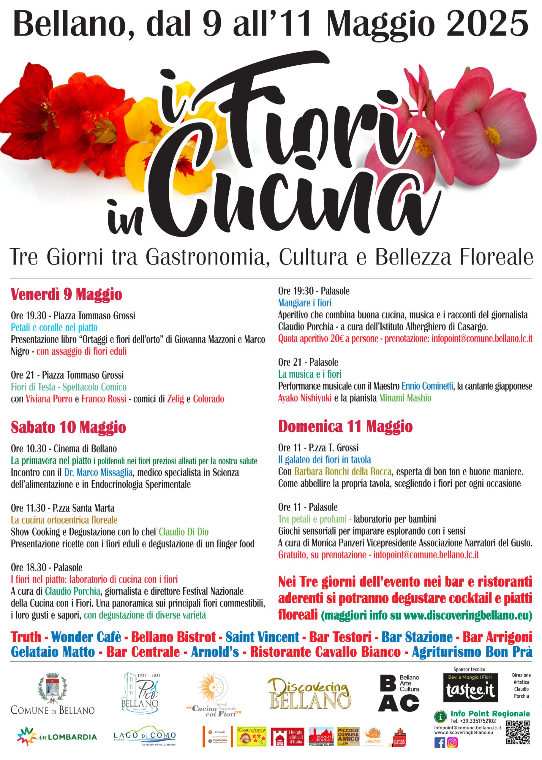 A Bellano dal 9 all’11 maggio i fiori saranno protagonisti anche in tavola con “I Fiori in Cucina”, promosso dal Comune di Bellano in collaborazione con il Festival della Cucina con i fiori diretto dal giornalista Claudio Porchia, un fine settimana da non perdere all’insegna della gastronomia, della cultura e della bellezza floreale.