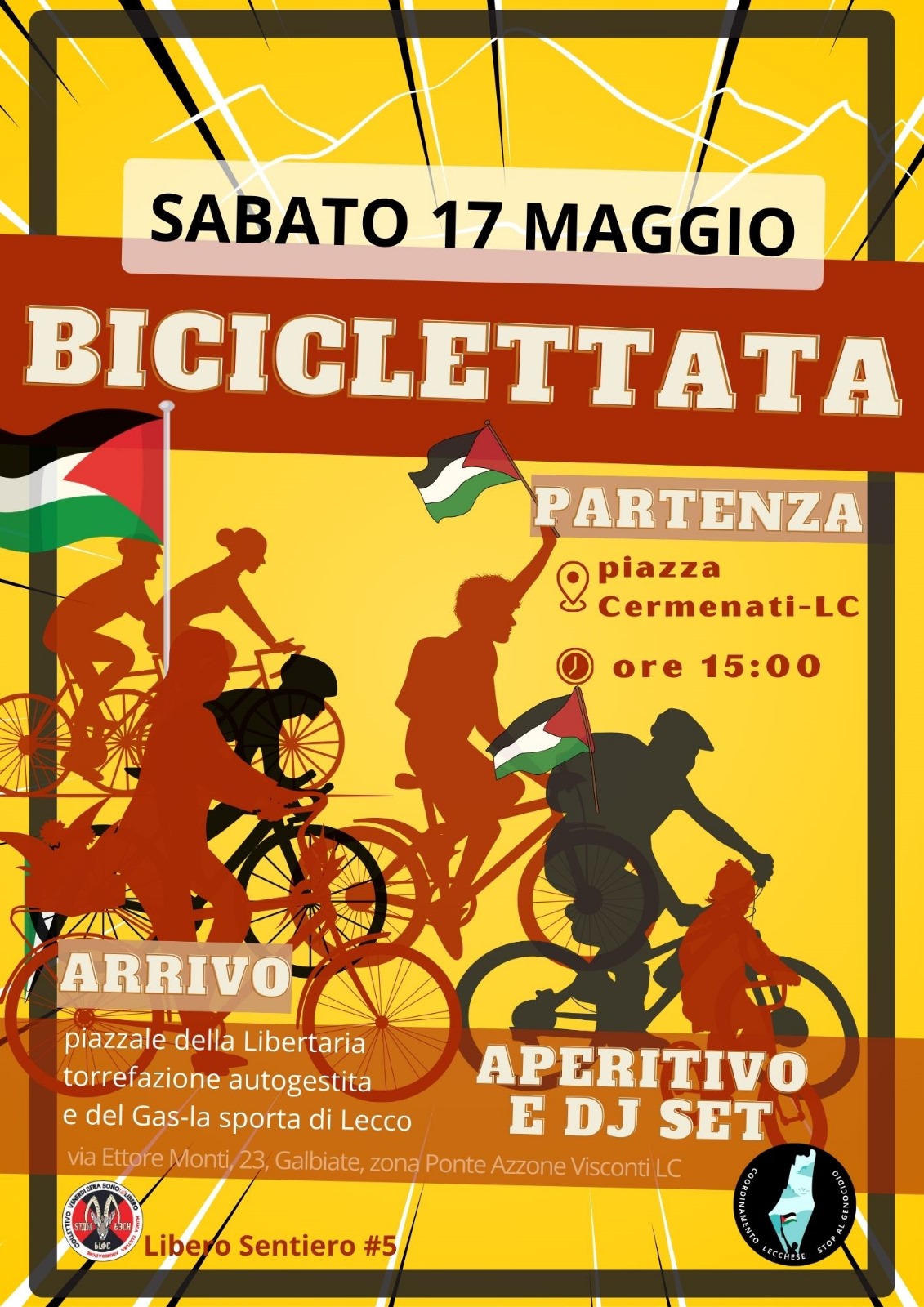 Il coordinamento “Stop al genocidio del popolo palestinese” comunica che Sabato 17 Maggio si terrà una biciclettata che sfilerà per le vie di Lecco per manifestare il sostegno al popolo palestinese e il dissenso alle politiche di sterminio  poste in atto dal governo israeliano. La biciclettata partirà da Piazza Cermenati alle ore 15.00 e si concluderà in via Ettore Monti a Galbiate. Si invita la popolazione a partecipare portando la propria bici munita da bandiera palestinese.