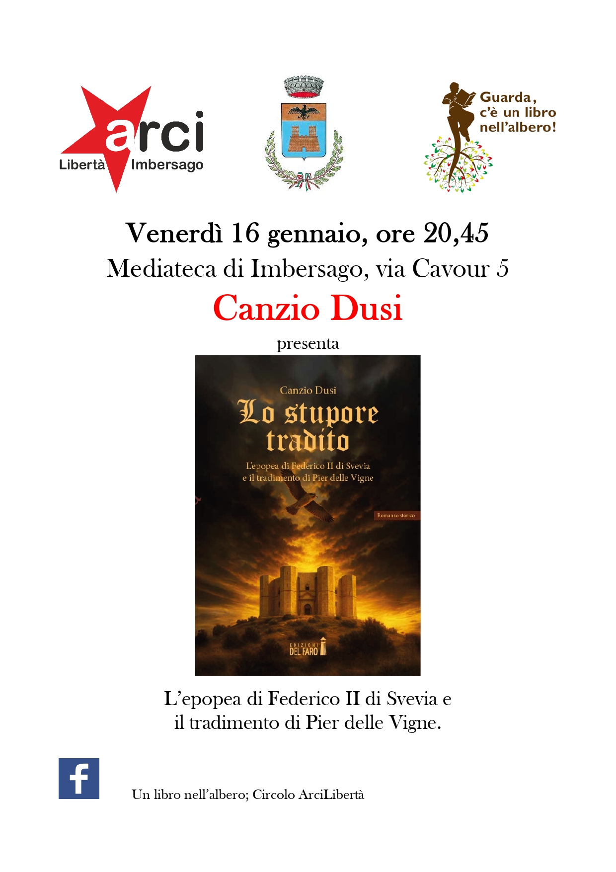 La Mediateca di Imbersago organizza per Venerdì 16 Gennaio, alle 20.45, un inocntro con Canzio Dusi, autore del libro Lo stupore perduto, epopea di Federico II di Svevia e il tradimento di Pier delle Vigne. L’incontro è organizzato dall’Arci Imbersgao ed è a ingresso gratuito.