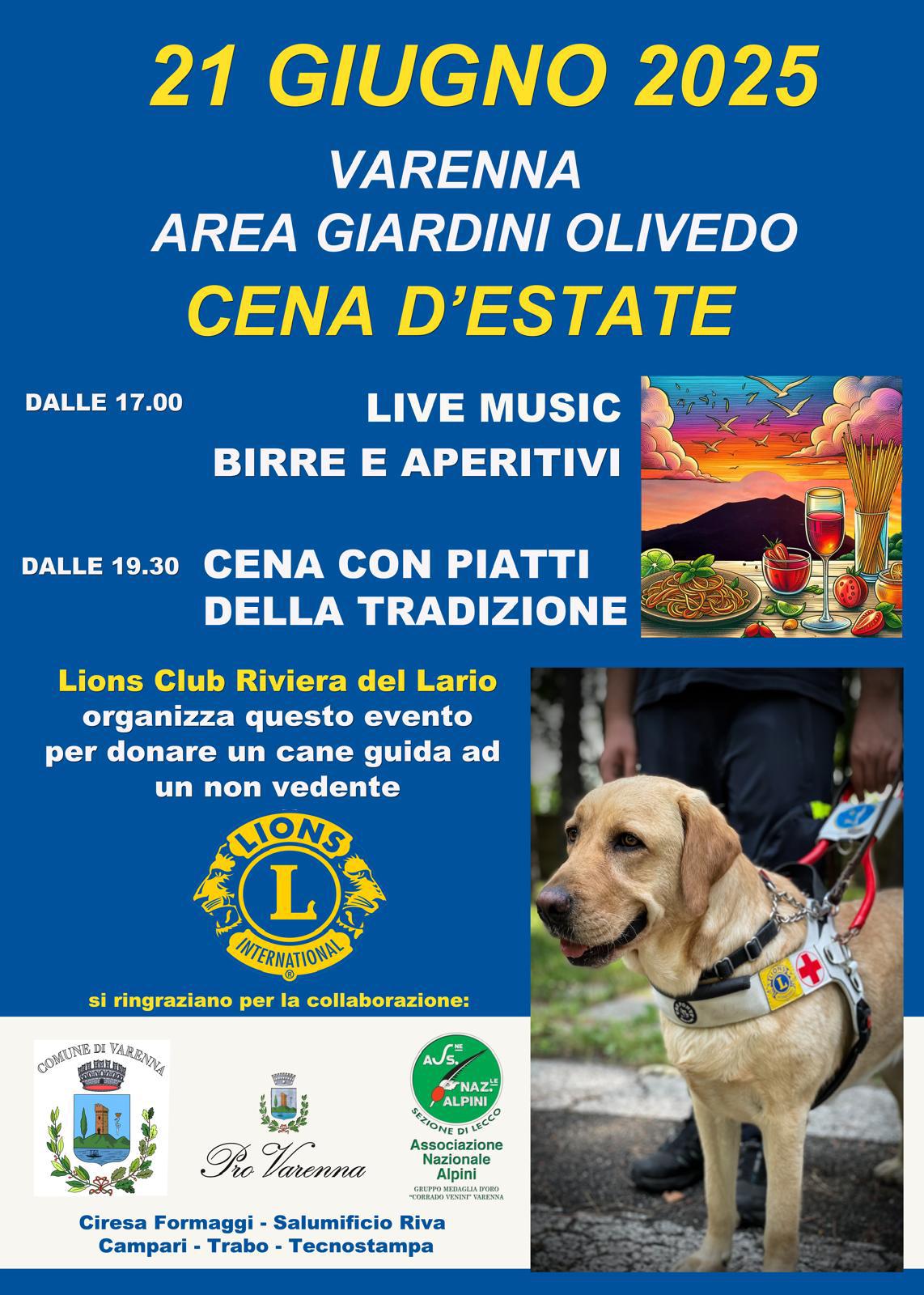 VARENNA – “Cena d’Estate” organizzata dal Lions Club Riviera del Lario per donare un cane guida ad un non vedente. L’evento si svolge nell’area giardini Olivedo.