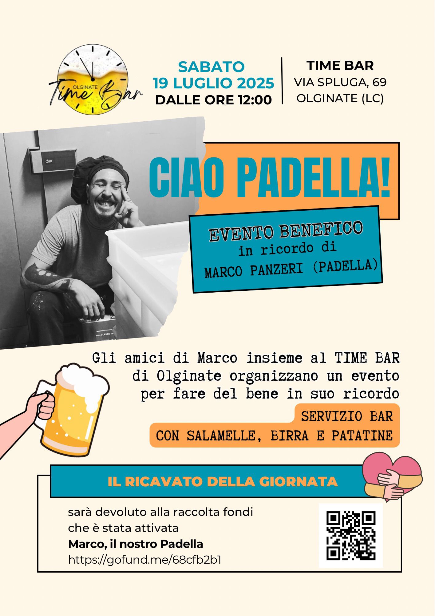 Sabato 19 Luglio si terrà l’evento benefico in memoria di Marco Panzeri – detto Padella – dal titolo Ciao Padella! L’evento, organizzato dagli amici di Marco per fare del bene in memoria di Padella, si terrà alle 12.00 al Time Bar in via Spluga 69 a Olginate. Per tutta la durata dell’evento sarà attivo il servizio bar con salamelle, birra e patatine.