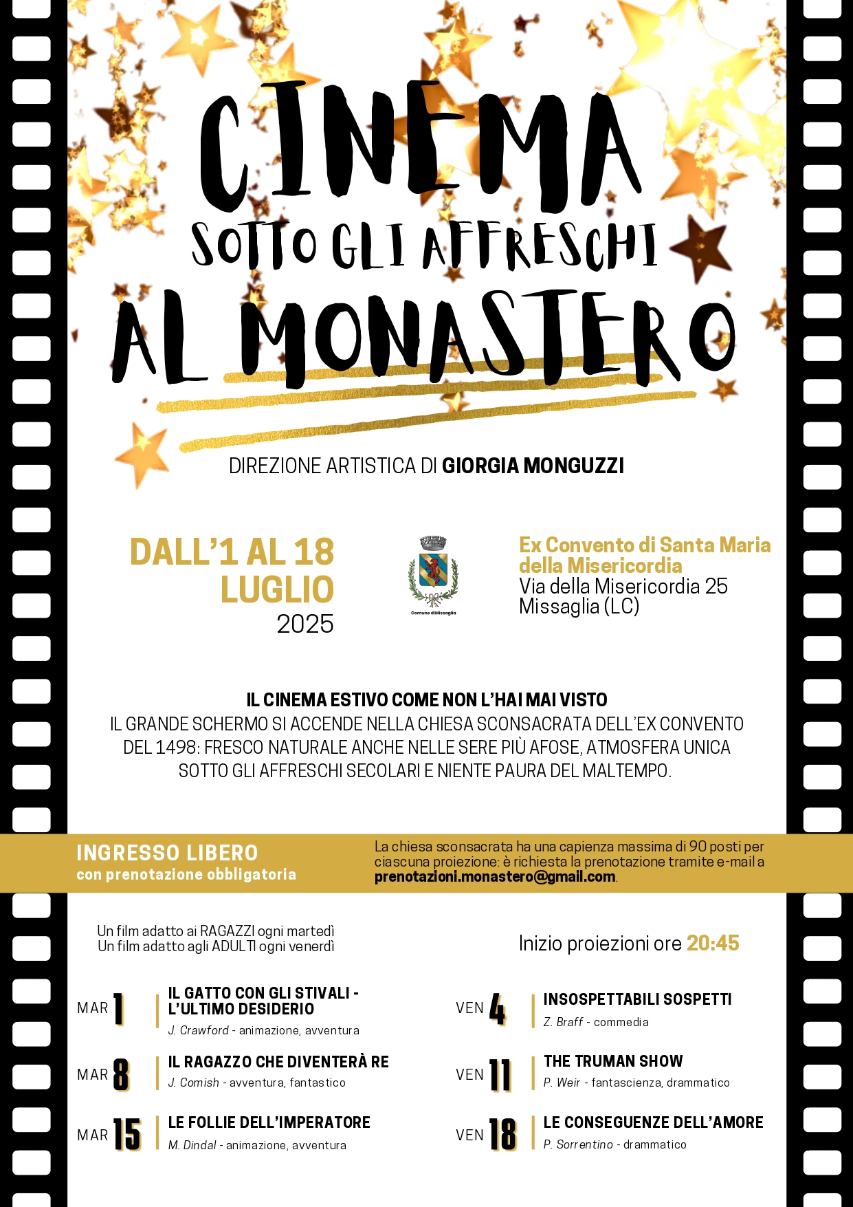 Anche quest’anno l’estate di Missaglia si accende con la magia del cinema, ma non sarà una semplice proiezione all’aperto: “Cinema sotto gli Affreschi al Monastero” è un evento che trasforma la visione di un film in una vera e propria esperienza immersiva. Sei serate, dall’1 al 18 Luglio, scandiranno la terza edizione di una rassegna che è ormai un piccolo gioiello dell’estate brianzola.