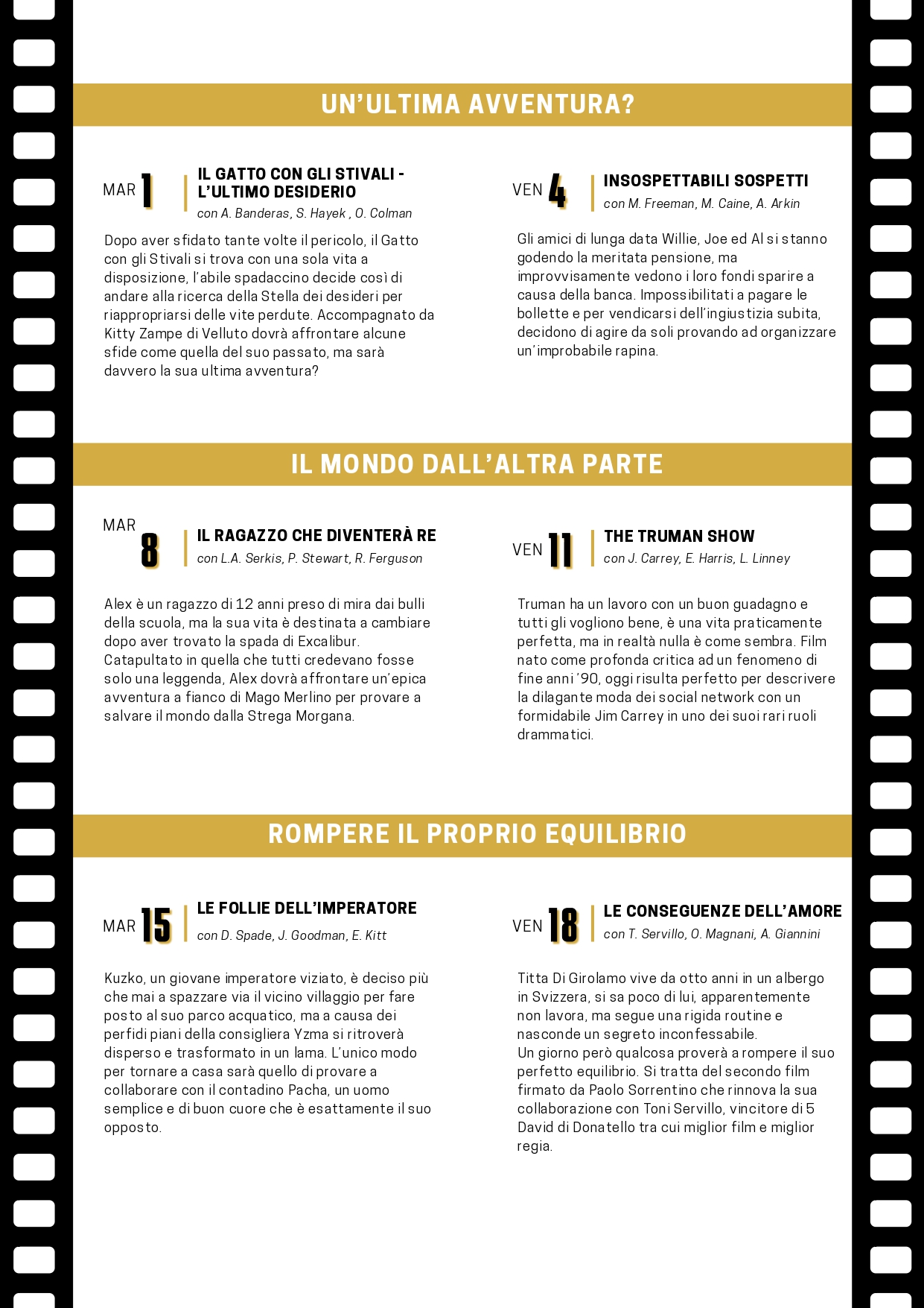 Le proiezioni, curate da Giorgia Monguzzi, giornalista monticellese esperta di cinema e direttrice artistica per il terzo anno consecutivo, si terranno ogni martedì e venerdì alle ore 20:45. I martedì saranno dedicati ai più giovani con film di animazione e avventura, mentre il venerdì toccherà agli adulti, con opere d’autore e storie ad alto impatto emotivo o sociale. Tra i titoli più attesi: “Il Gatto con gli Stivali – L’ultimo desiderio”, “Le Follie dell’Imperatore”, “The Truman Show” e “Le Conseguenze dell’Amore” di Paolo Sorrentino. Ogni serata sarà introdotta da una breve presentazione della direttrice artistica, e il pubblico riceverà una scheda di accompagnamento con curiosità e chiavi di lettura per approfondire la visione prima o dopo la proiezione.