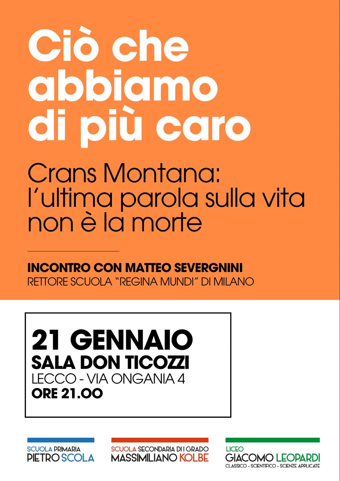 L’incontro, che si terrà Mercoledì 21 Gennaio alle 21.00 presso la Sala Don Ticozzi di Lecco, ha come titolo Ciò che abbiamo di più caro. Crans Montana: l’ultima parola sulla vita non è la morte, e vedrà la partecipazione di Matteo Severgnini, Rettore della Scuola Regina Mundi di Milano, che approfondirà la proposta educativa che ha dato origine e anima alle scuole di Rancio. “Qual è il ruolo che abbiamo noi adulti nei confronti dei nostri bambini e ragazzi? Quale proposta facciamo? Quale strada indichiamo? Cosa costruiamo con loro e per loro ogni giorno a casa e a scuola?”, queste le domande che presidi e personale scolastico si sono posti e alle quali si cercherà di dare risposta insieme a Severgnini. Un momento di confronto reale tra adulti – genitori e insegnanti – che condividono la responsabilità educativa verso i giovani.
