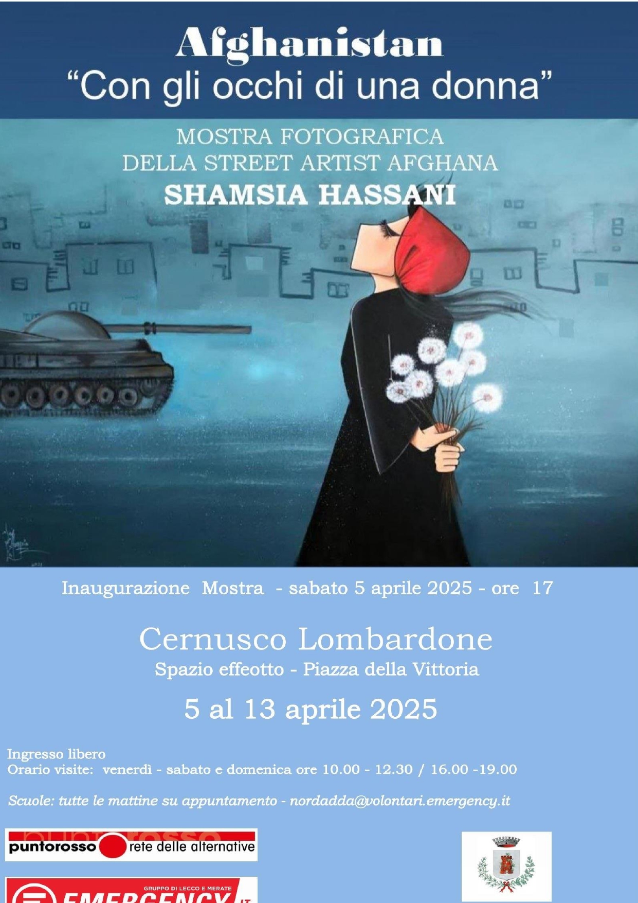 Emergency, in collaborazione con l’associazione “Punto Rosso” di Cernusco Lombardone, propongono, dal 5 al 13 aprile presso lo spazio Effeotto, in piazza della Vittoria, a Cernusco Lombardone, la mostra fotografica della street-artist afghana Shamsia Hassani dal titolo “Con gli occhi di una donna“. La mostra comprende 50 tra foto e opere sulla condizione femminile in Afghanistan.