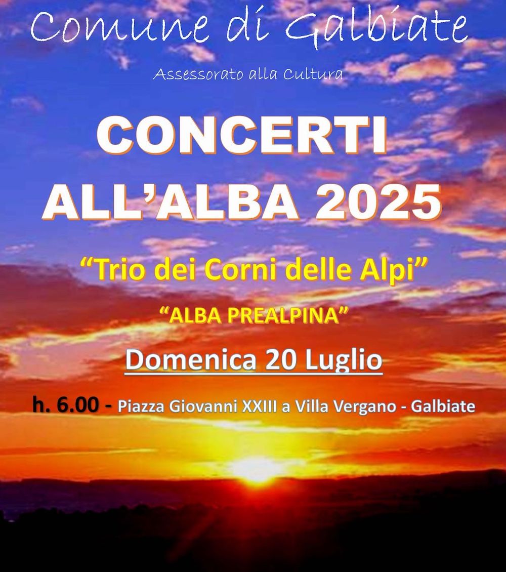 Domenica 20 Luglio alle si terrà a Galbiate, un altro appuntamento della rassegna Concerti all’Alba. Il concerto, dal titolo Alba Prealpina, si terrà presso la Piazza Giovanni XXVIII a Villa Vergano e vedrà l’esibizione del Trio dei Corni delle Alpi.