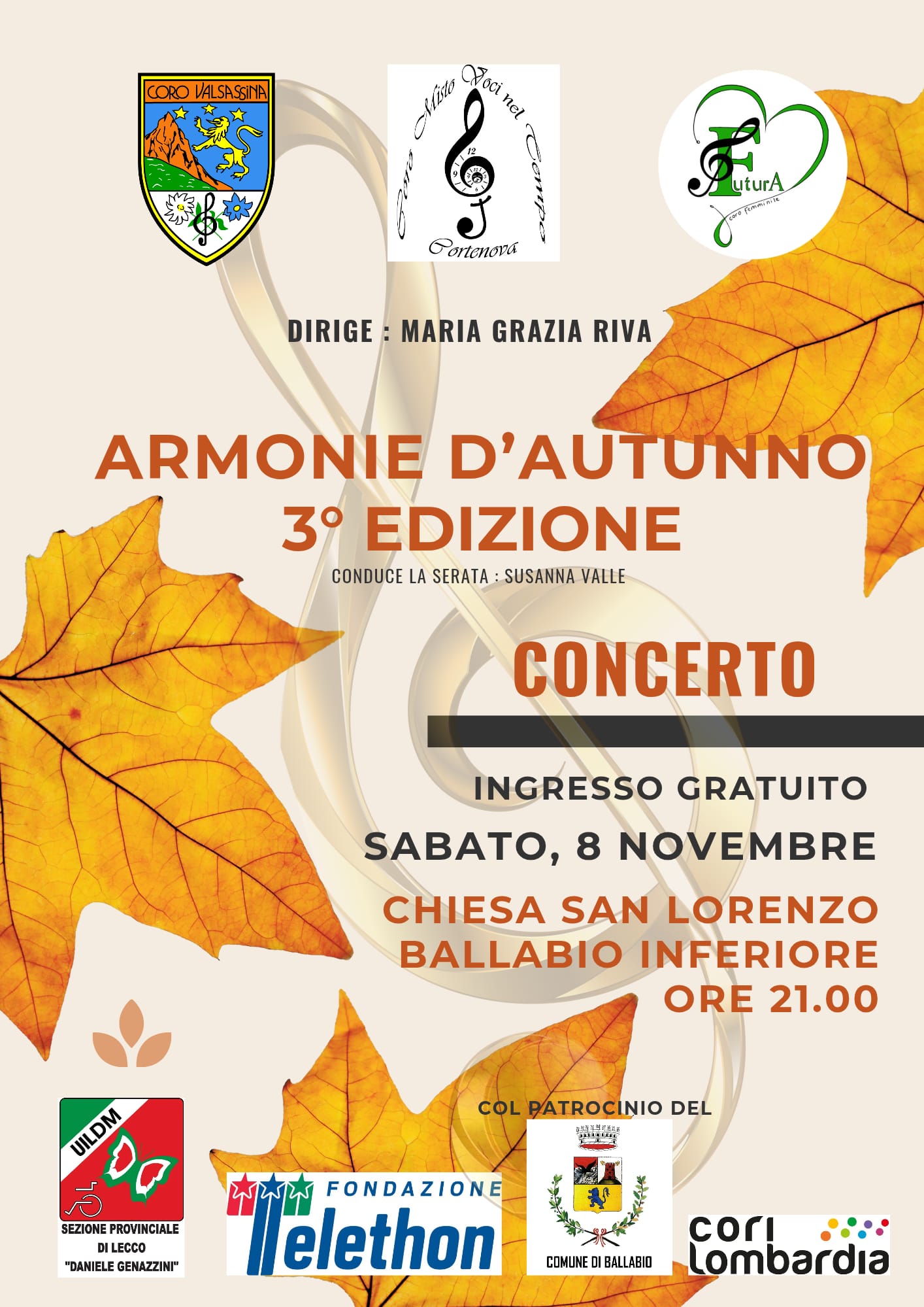 Sabato 8 Novembre alle 21.00, presso la Chiesa Parrocchiale di San Lorenzo a Ballabio, si terrà il concerto corale Armonie d’autunno 3° edizione con il Coro Valsassina, Coro femminile Futura di Lecco e Coro Voci nel tempo di Cortenova. Il concerto è a ingresso libero.