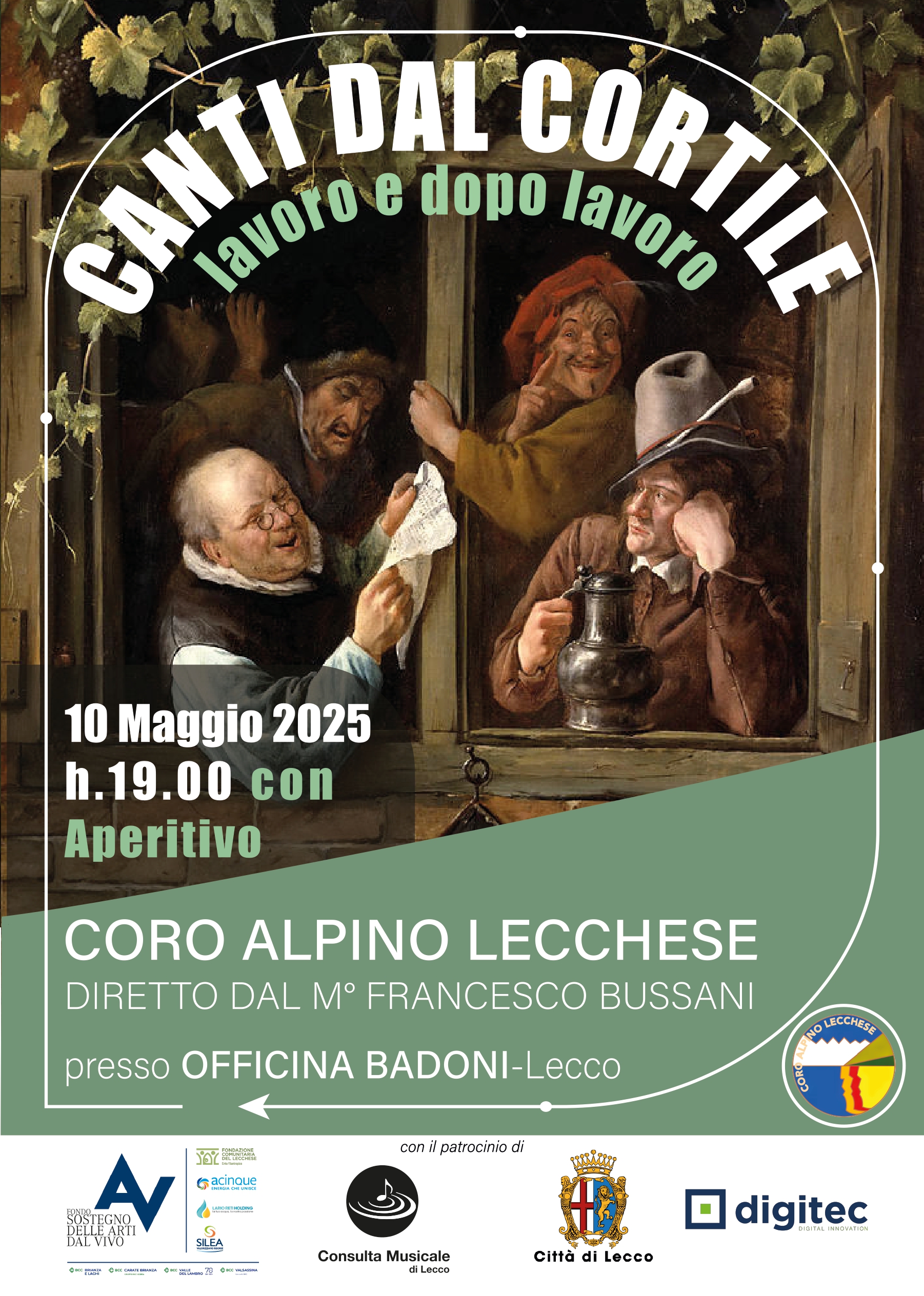 Il Coro Alpino Lecchese promuove per il 2025 un nuovo progetto con il sostegno dell’Ente fondazione di Lecco “Fondo Ambiente e Cultura“: Sabato 10 maggio alle 19.00 presso l’Officina Badoni in corso Matteotti 7 si terrà il primo concerto dei questo progetto. Per quest’anno si è deciso di esplorare il tema dei canti che forse più semplicemente si associano al termine popolare: canti da osteria legati al bere e al mangiare, canti legati alla festa e alla danza, canti legati ad una narrazione divertita e a volte maliziosa della vita concreta della gente comune.
