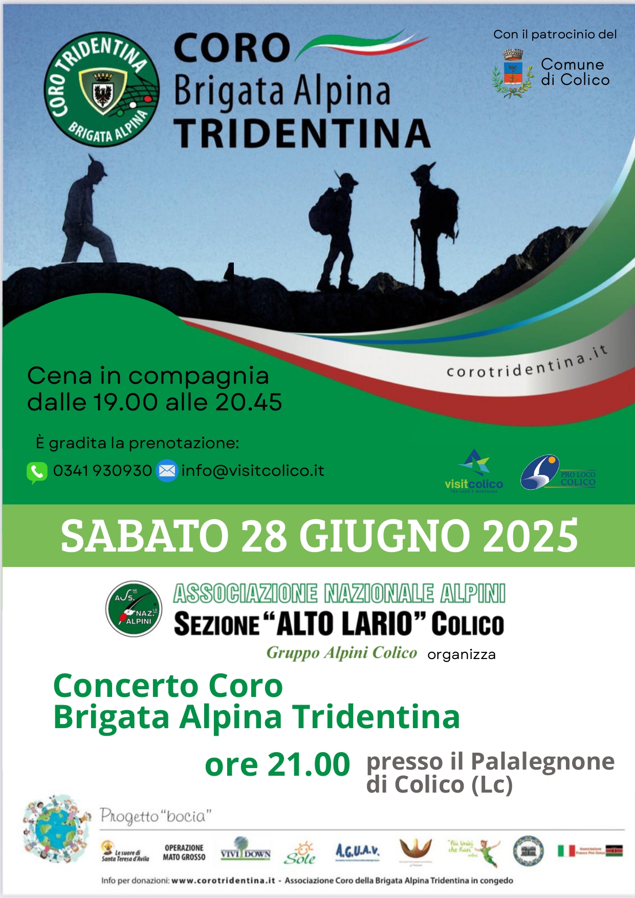Dal 2006, il Coro della Brigata Alpina Tridentina devolve i proventi dei concerti ad associazioni che aiutano persone in difficoltà, soprattutto bambini. I fondi vengono assegnati direttamente e secondo urgenze specifiche. Alcune associazioni sostenute sono: OMG – Operazione Mato Grosso, “Più unici che rari” Onlus, Speranza Oltre le Encefalopatie e molte altre. Per la cena è gradita la prenotazione alla email info@visitcolico.it e al numero 0341930930, mentre per il concerto ingresso libero.