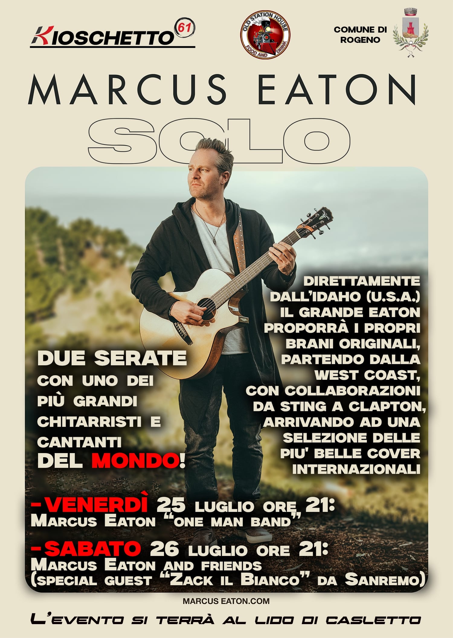 Marcus Eaton terrà due serate del suo tour Solo presso il Kioschetto 61 al Lido di Casletto, a Rogeno. Il chitarrista originario dell’Idaho suonerà da solo Venerdì 25 Luglio alle 21.00 e in compagnia di Zack il Bianco da Sanremo Sabato 26 Luglio, sempre alle 21.00. Eaton proporrà brani originali e collaborazioni come quelle con Sting ed Eric Clepton, arrivando a suonare cover internazionali.