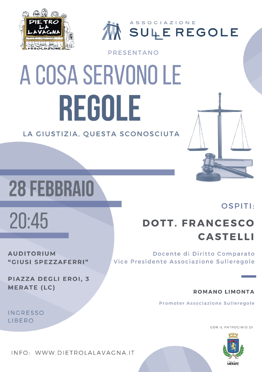 L’associazione DietroLaLavagna in collaborazione con l’associazione Sulleregole (https://www.sulleregole.it/) propone una conferenza aperta a tutta la cittadinanza sui temi della giustizia, Costituzione e legalità con l’idea che l’approfondimento di questi temi contribuisca a modificare l’atteggiamento negativo che tanti hanno nei confronti delle regole.