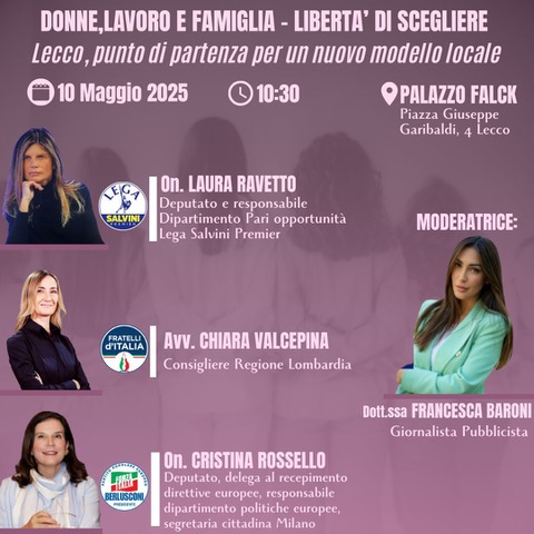 Sabato 10 maggio 2025, alle ore 10:30, presso Palazzo Falck (Piazza Giuseppe Garibaldi 4, Lecco), si terrà il convegno “Donne, Lavoro e Famiglia – Libertà di Scegliere”, promosso da esponenti del centrodestra con l’obiettivo di promuovere una riflessione concreta su pari opportunità, valorizzazione del ruolo della donna e libertà di scelta tra lavoro e famiglia.