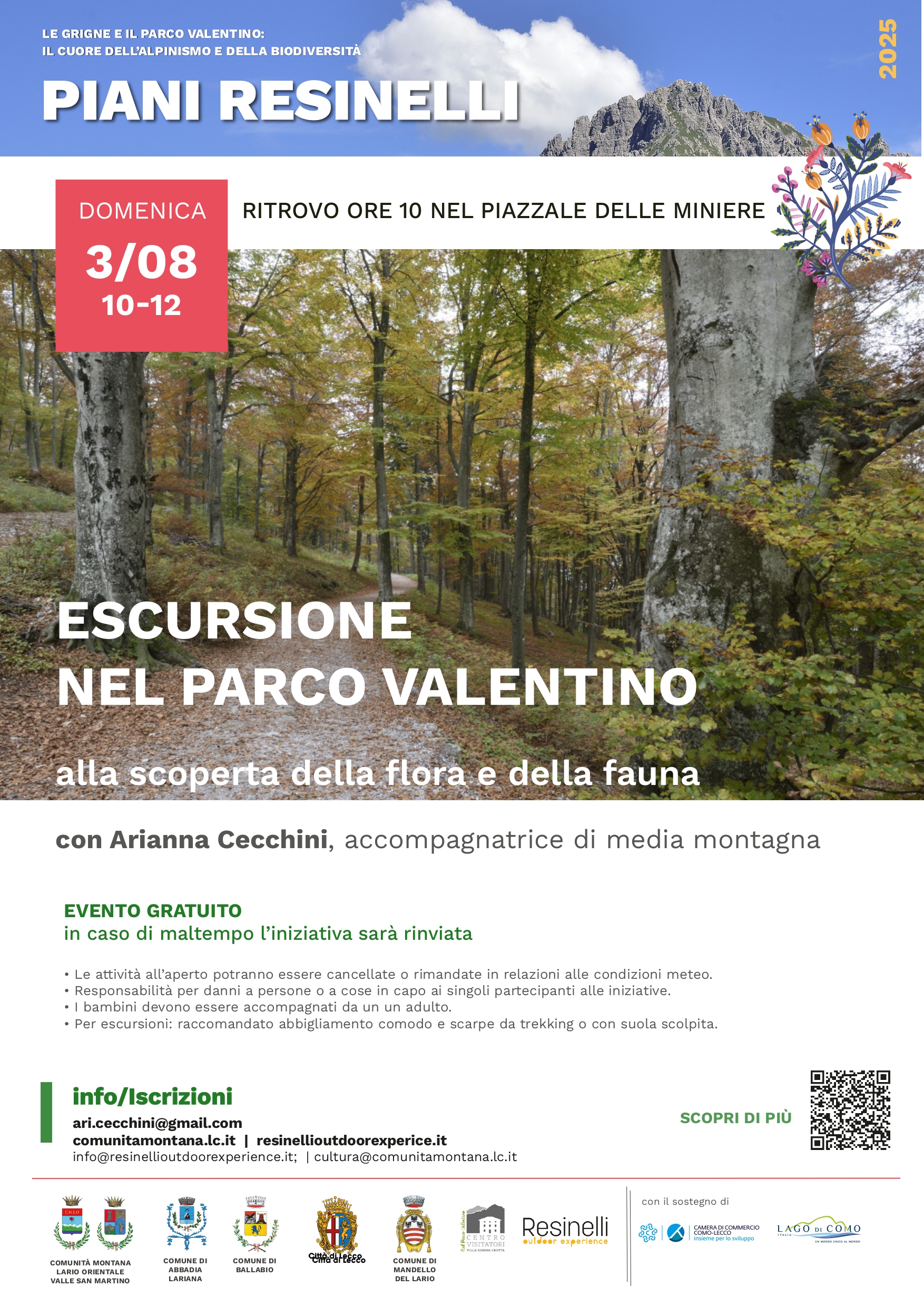 Domenica 3 Agosto si terrà dalle 10.00 alle 12.00 un’escursione nel Parco Valentino ai Piani Resinelli, con Arianna Cecchini, accompagnatore di media montagna.