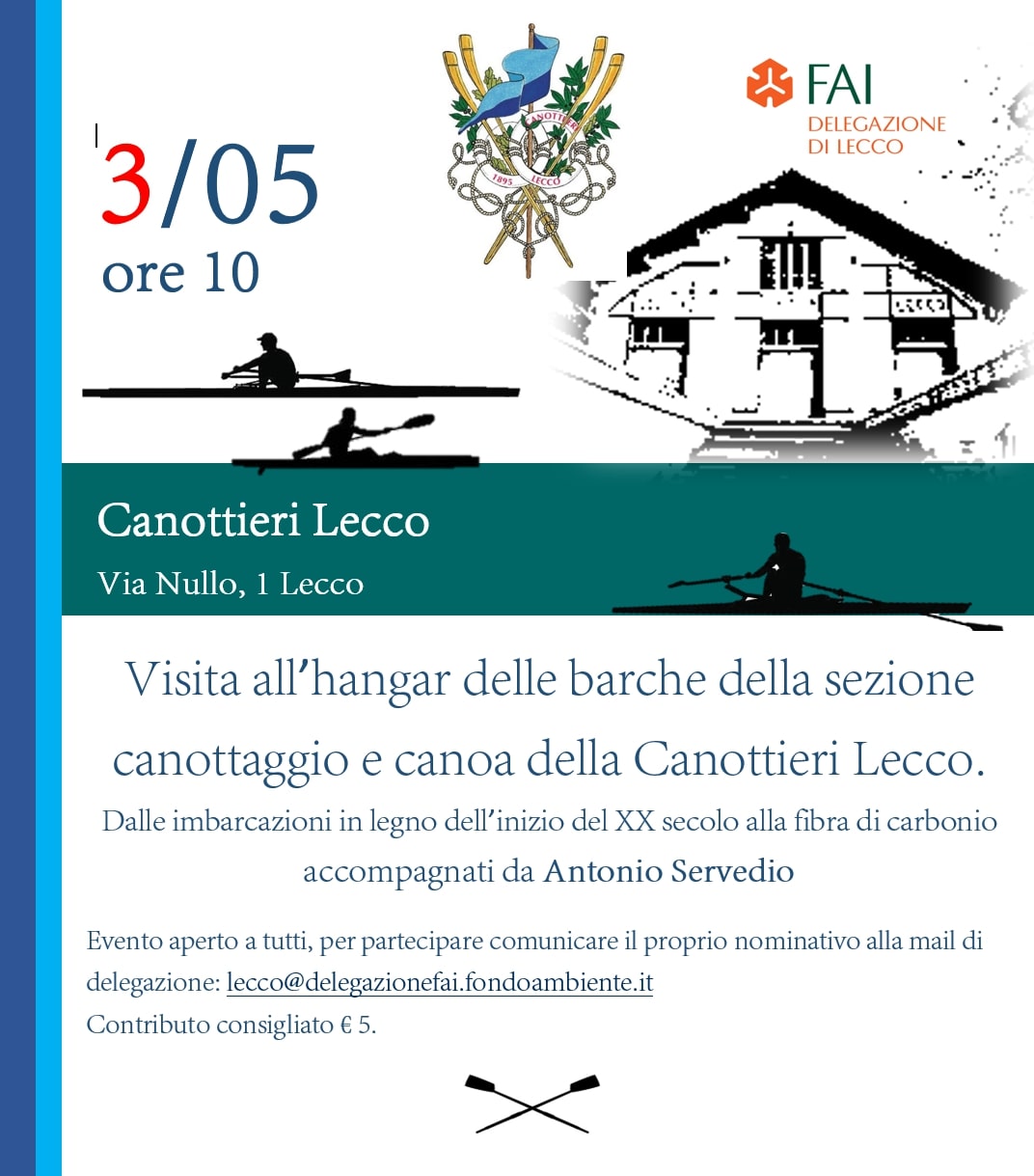 Nell’ambito di una serie di eventi che verranno organizzati per celebrare i 130 anni della Società Canottieri Lecco è stata organizzato dalla delegazione FAI una visita all’hangar delle barche della sezione canottaggio e canoa. Durante la visita, prevista alle 10.00 del 3 Maggio si potrà scoprire l’evoluzione di queste imbarcazioni nel corso di più di un secolo, dall’inizio del ‘900 quando venivano fabbricate in legno fino ad oggi che, realizzate con l’uso di materiali come il carbonio, sono diventate molto più leggere e veloci. Si arriverà anche a conoscere come è cambiata la forma nel tempo dei remi e delle pagaie e quali innovazioni sono state introdotte alla ricerca di soluzioni sempre più performanti. Antonio Servedio, che accompagnerà la visita, è un atleta, oggi a livello Master, sia canottiere che canoista. Spiegherà con grande passione l’evoluzione, la grande tradizione ed alcune curiosità di questo sport di antica origine.