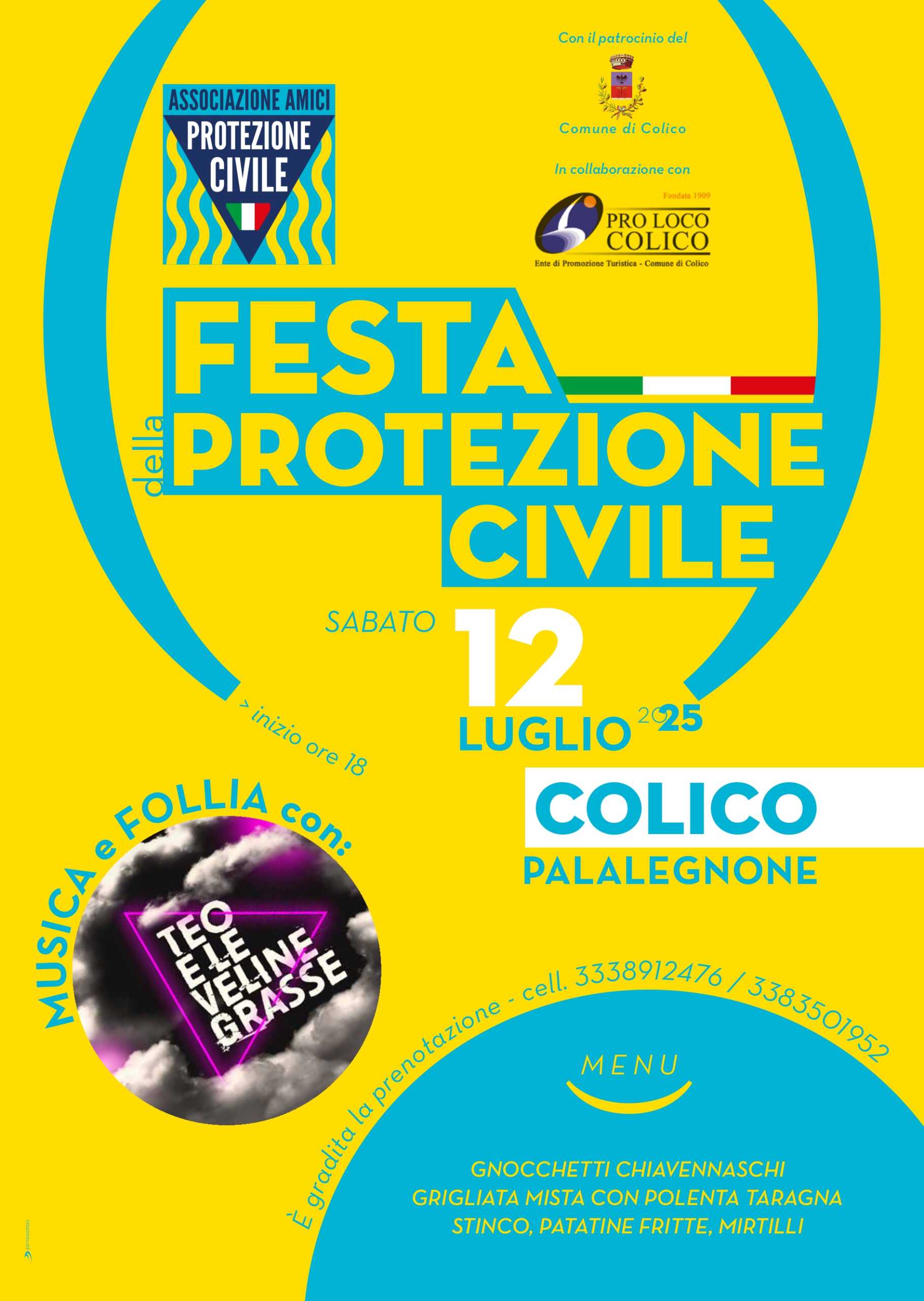 Sabato 12 Luglio si terrà l’annuale Festa degli amici della Protezione Civile presso il Palalegnone a Colico. La festa inizierà alle 18.00 con la cena a base di gnocchetti chiavennaschi, grigliata mista con polenta taragna, stinco e patatine fritte. A seguire il concerto della band “Teo e le Veline Grasse”, che allieteranno la serata.