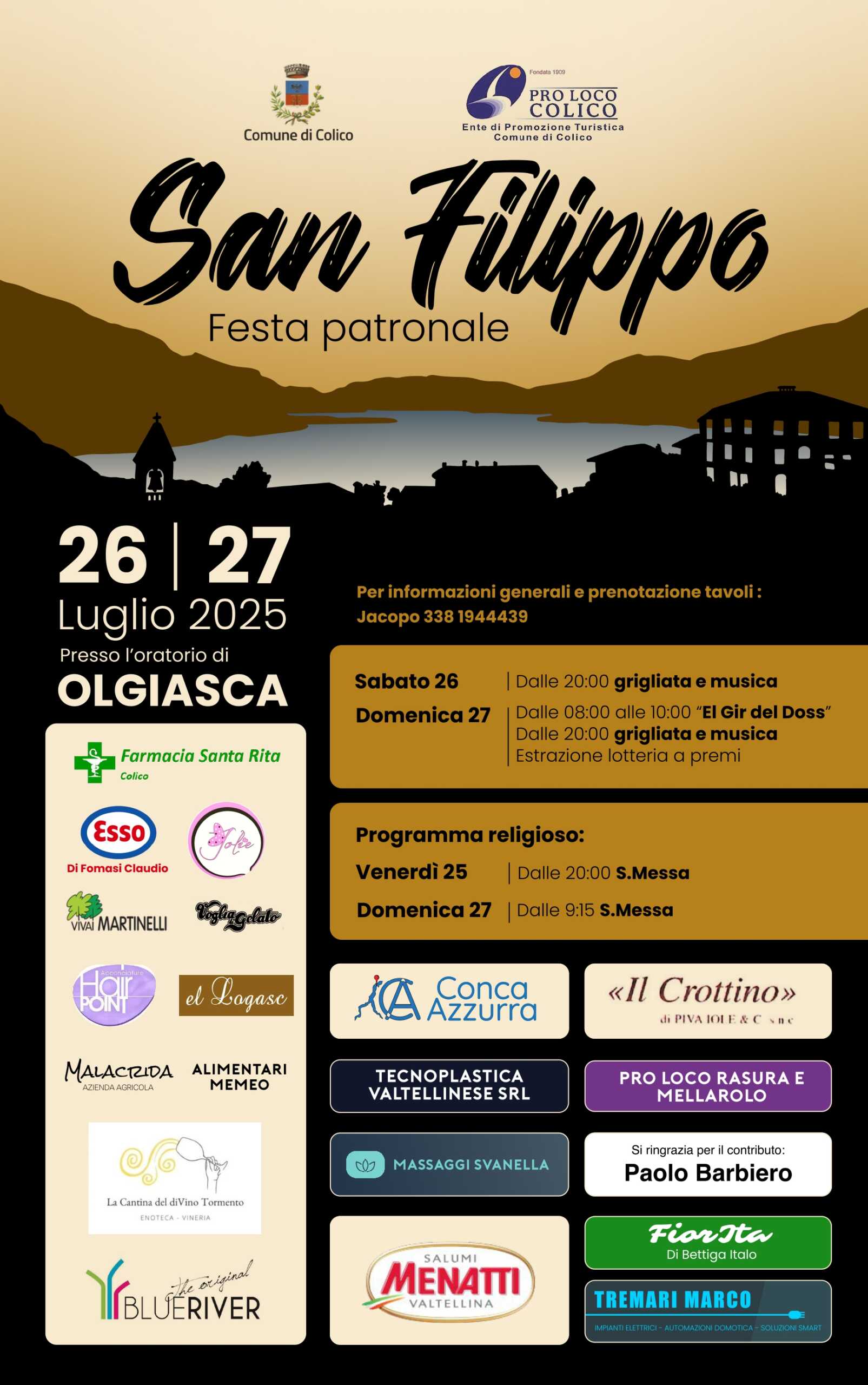 Torna anche quest’anno a Colico, presso l’Oratorio di Olgiasca, la tradizionale Festa di San Filippo, un weekend di allegria, buona cucina, musica e momenti di comunità nel cuore dell’estate!
