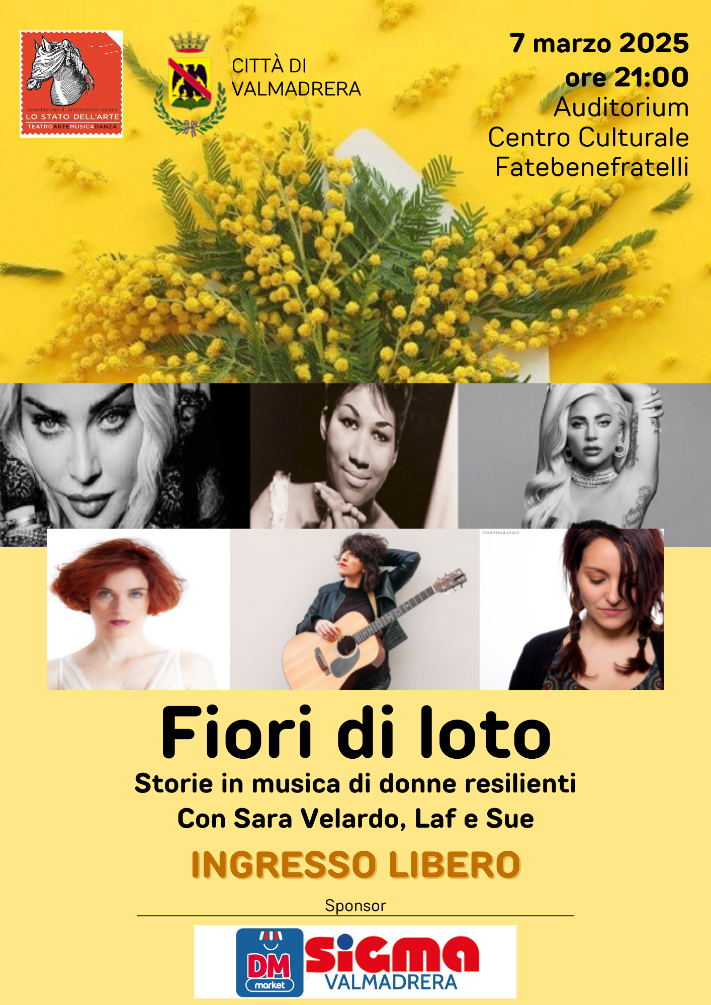 In occasione dell’8 marzo l’amministrazione comunale di Valmadrera propone ‘Fiori di loto – Storie in musica di donne resilienti’, una serata concerto con brani musicali scelti per la loro valenza e, per ciascuno, una presentazione del contesto sociale e culturale di riferimento. Sul palco le musiciste e cantautrici Sara Velardo, Laf (Francesca Sabatino) e Sue (Susanna Cisini).