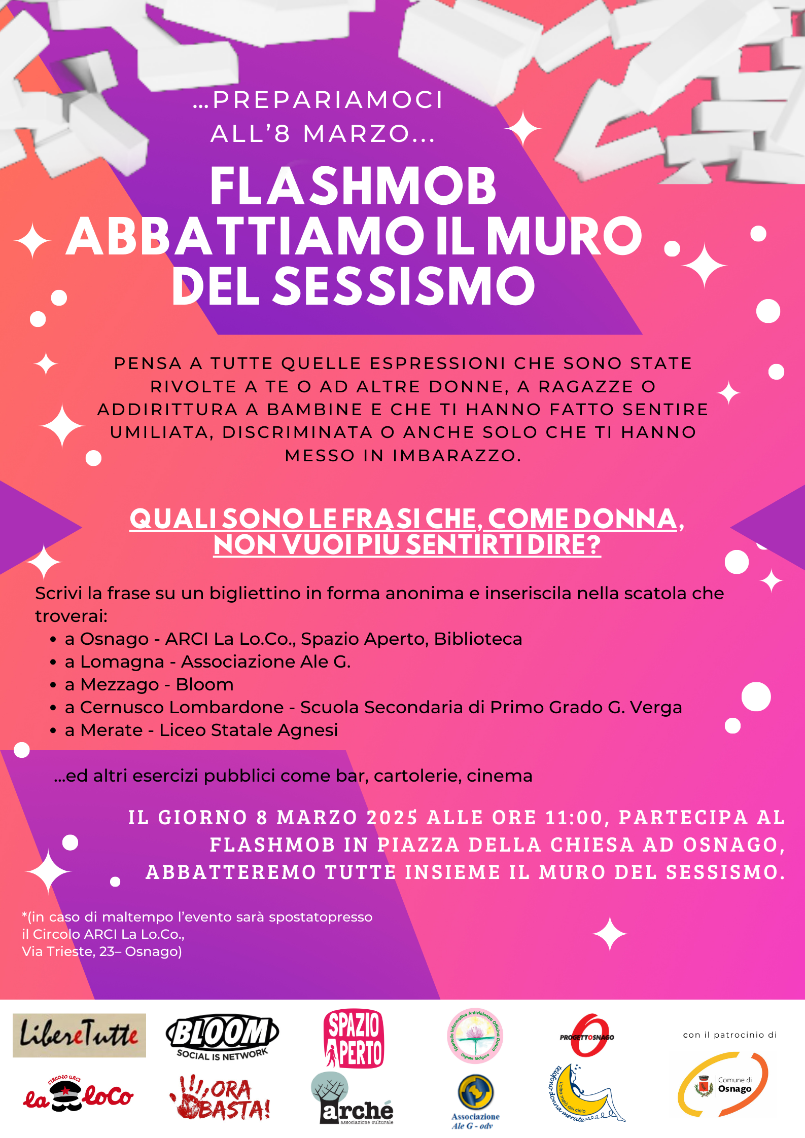 L’8 Marzo alle 11.00 in Piazza della Chiesa a Osnago si terrà un Flashmob dal titolo “Abbattiamo il muro del sessismo“. L’iniziativa è stata pensata come reazione a tutte quelle espressioni umilianti che ogni donna, nel corso della sua vita, si è sentita rivolgere, provocando imbarazzo e facendo sentire discriminata. Durante il flashmob le partecipanti scriveranno su un biglietto le frasi che, come donne, non vogliono più sentirsi dire e le inseriranno in forma anonima nelle scatole che si trovano: