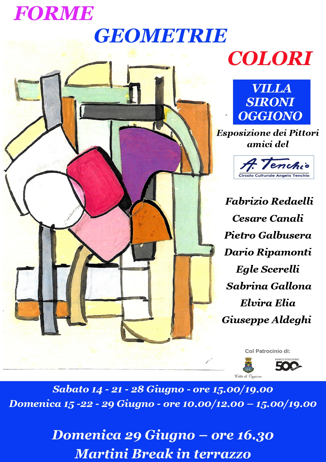 Il Circolo Culturale Angelo Tenchio presenta, dal 14 al 29 Giugno, presso Villa Sironi a Oggiono, l’esposizione delle opere degli artisti amici del Circolo. L’evento è patrocinato dal Comune di Oggiono. La Mostra sarà visitabile Sabato 14, 21 e 28 Giugno dalle 15.00 alle 19.00 e Domenica 15, 22 e 29 Giugno dalle 10,00 alle 12.00 e dalle 15.00 alle 19.00. L’ultimo giorno di esposizione si terrà alle 16.30 un Martini Break in terrazza.