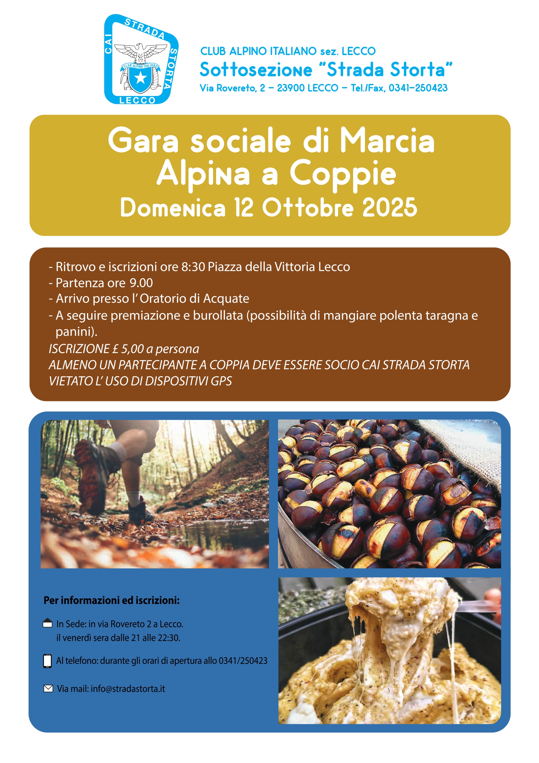 Domenica 12 Ottobre si terrà la tradizionale Gara Sociale di Marcia Alpina del C.A.I. Strada Storta, un’occasione per trascorrere una giornata di sport, divertimento e amicizia lungo i sentieri che conosciamo e amiamo. Le iscrizioni apriranno alle 8.30 in Piazza della Vittoria a Lecco, mentre la gara inizierà alle 9.00. Le premiazioni si troveranno al termine della manifestazione presso l’oratorio di Acquate.