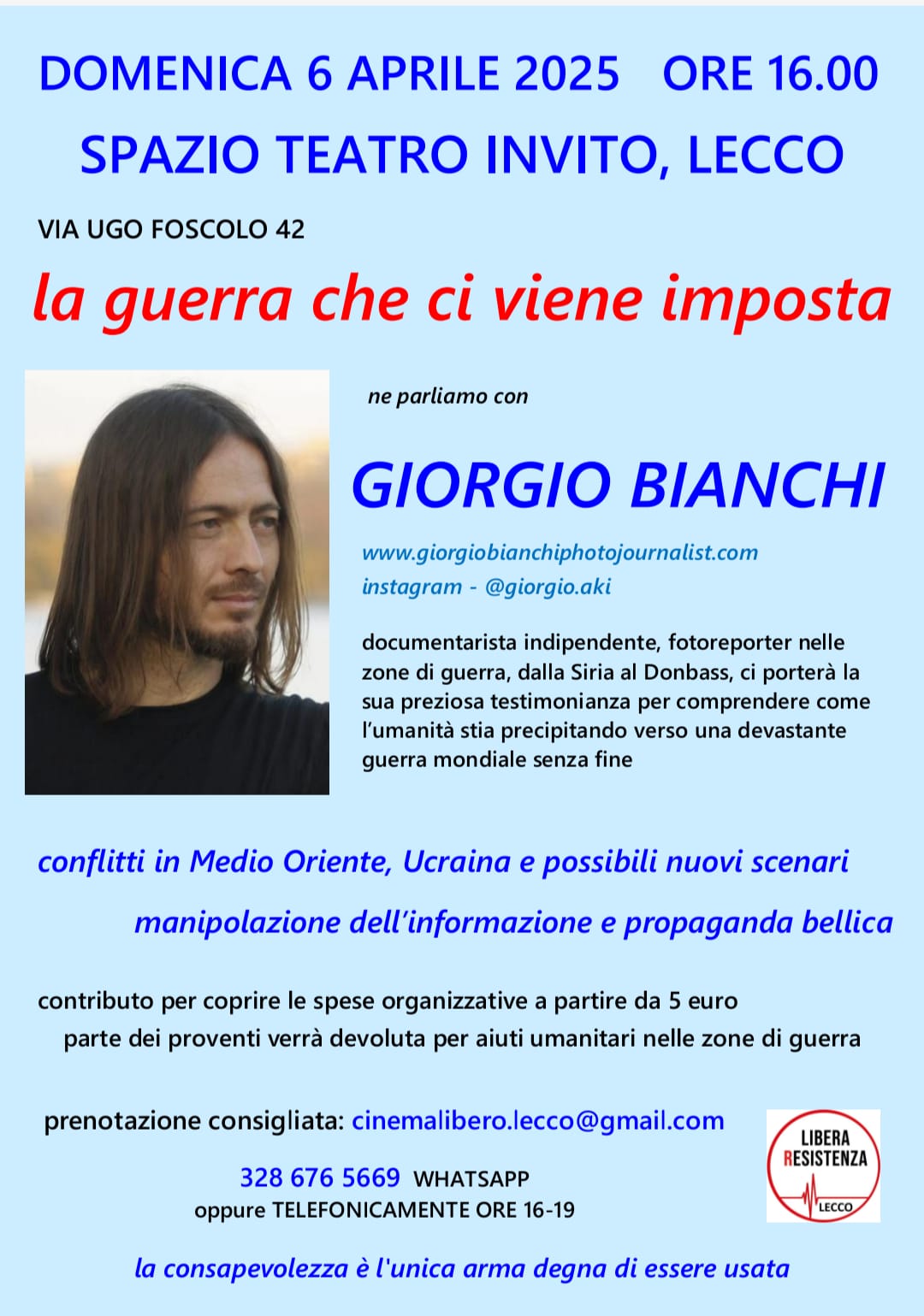 Domenica 6 aprile alle 16.00 presso Spazio Teatro Invito, si terrà un incontro con Giorgio Bianchi sul tema “La guerra che ci viene imposta”.