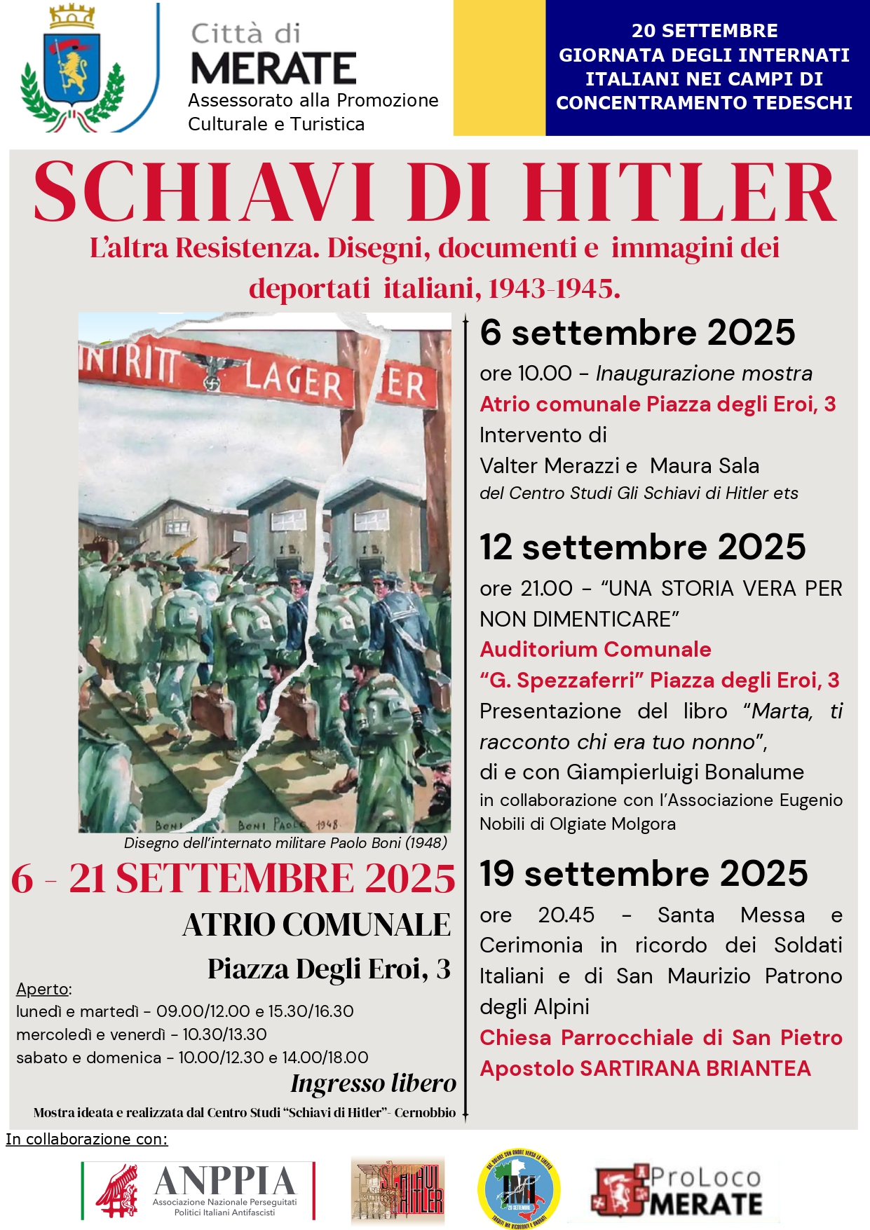 Il Comune di Merate celebra questo triste ricordo con diverse iniziative. Dal 6 al 21 Settembre sarà possibile visitare, presso l’Atrio Comunale, la mostra Schiavi di Hitler – L’altra Resistenza. Disegni, documenti e immagini dei deportati italiani, 1943-1945, che verrà inaugurata proprio Sabato 6 con interventi di Valter Merazzi e Maura Sala, del Centro Studi Gli Schiavi di Hitler di Cernobbio. La mostra sarà visitabile il Lunedì e Martedì dalle 9.00 alle 12.00 e dalle 15.30 alle 16.30; il Mercoledì e Venerdì dalle 10.30 alle 13.30; Sabato e Domenica dalle 10.00 alle 12.30 e dalle 14.00 alle 18.00.