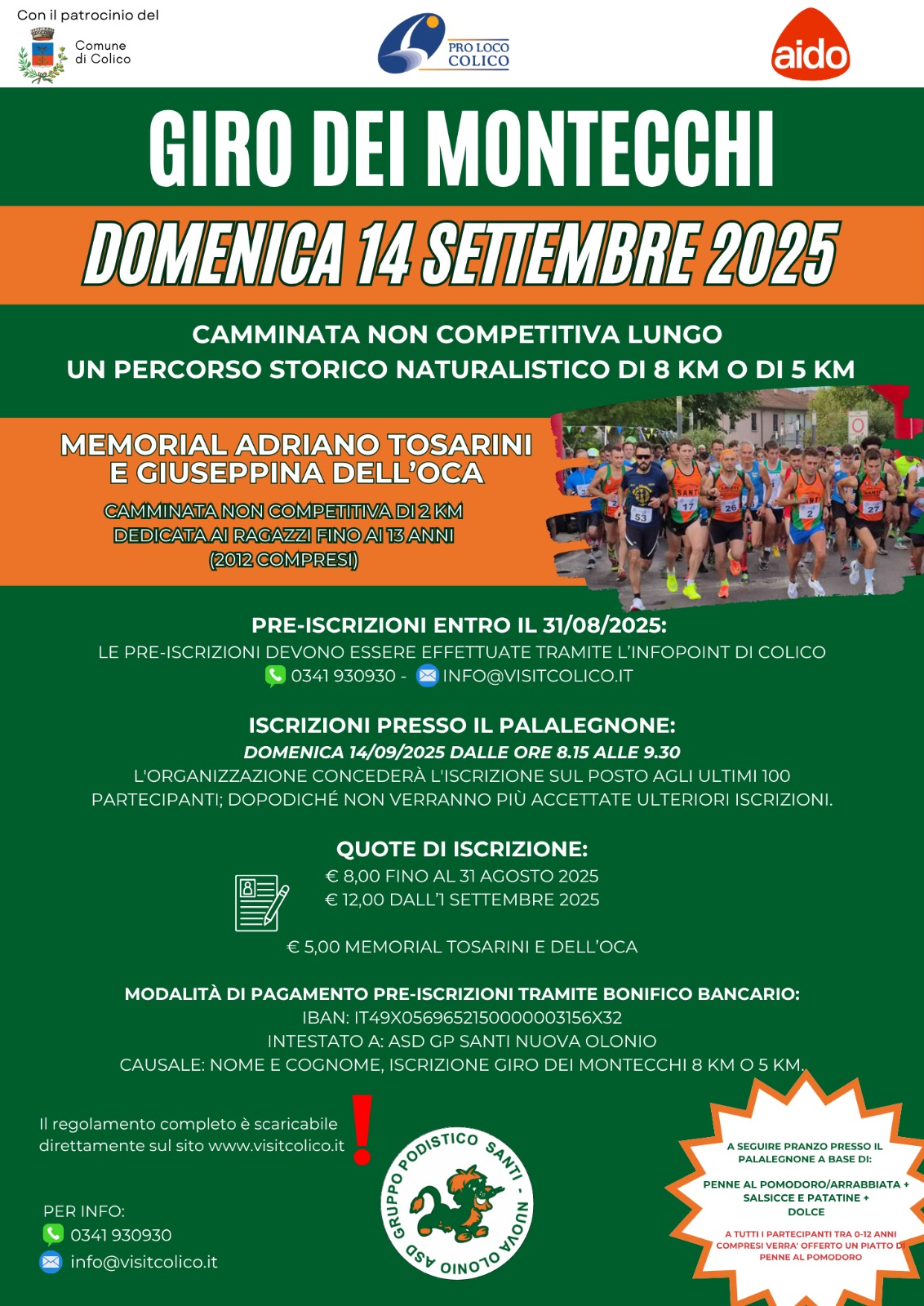 Domenica 14 Settembre si terrà la XVII edizione del Giro dei Montecchi a Colico, la Camminata non competitiva, a passo libero, lungo un percorso storico naturalistico di 8 km. Quest’anno ci sarà anche un percorso di 5 km. A seguire pranzo presso il Palalegnone.