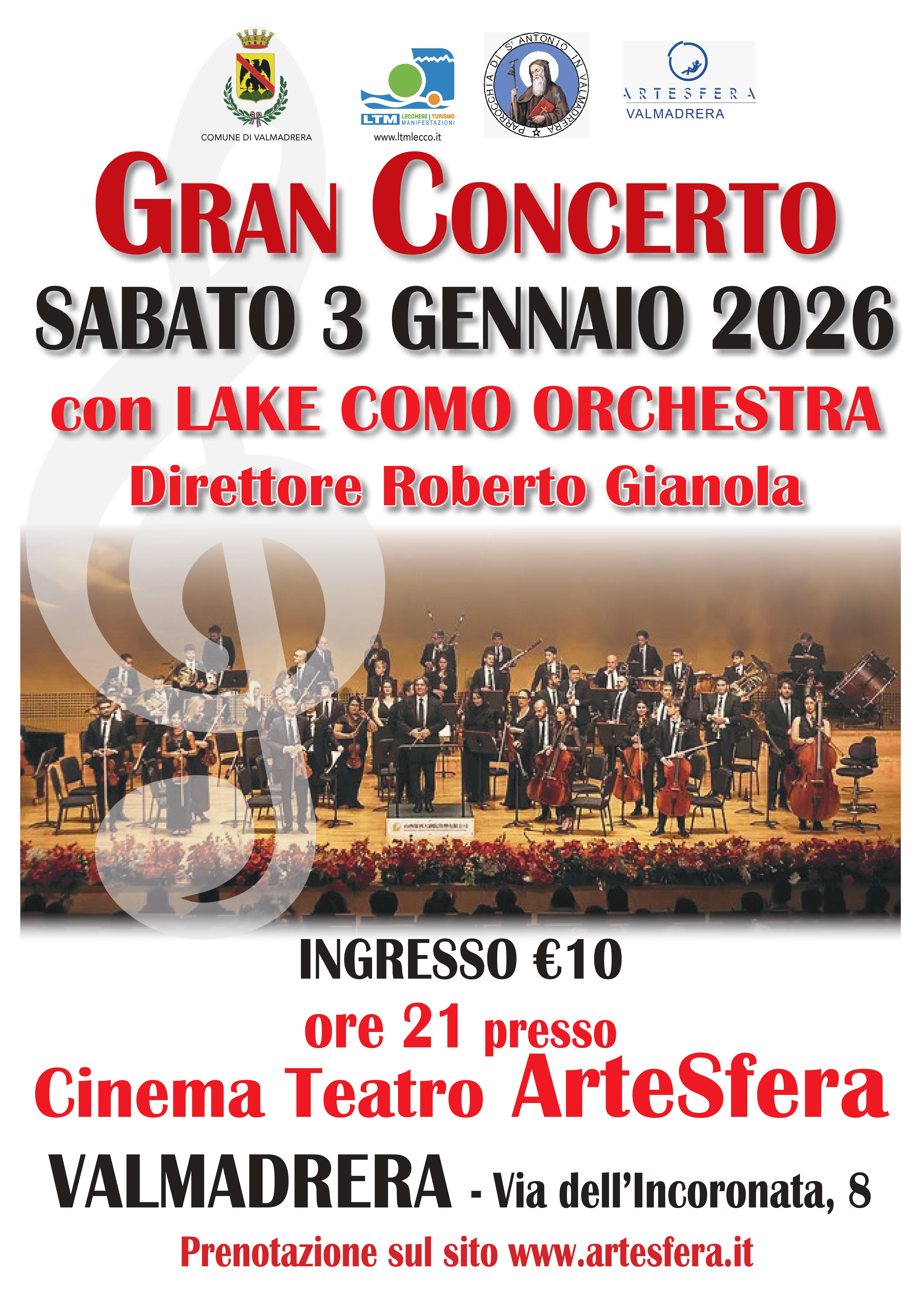 La sala della Comunità Artesfera in collaborazione con il Comune di Valmadrera ed LTM – Lecchese Turismo Manifestazioni propone per l’inizio del nuovo anno il Gran Concerto con la Lake Como Orchestra, in programma Sabato 3 Gennaio alle 21.00 presso il Cinema Teatro ArteSfera di Valmadrera. Il costo del biglietto è di 10 euro, con prenotazione sul sito.