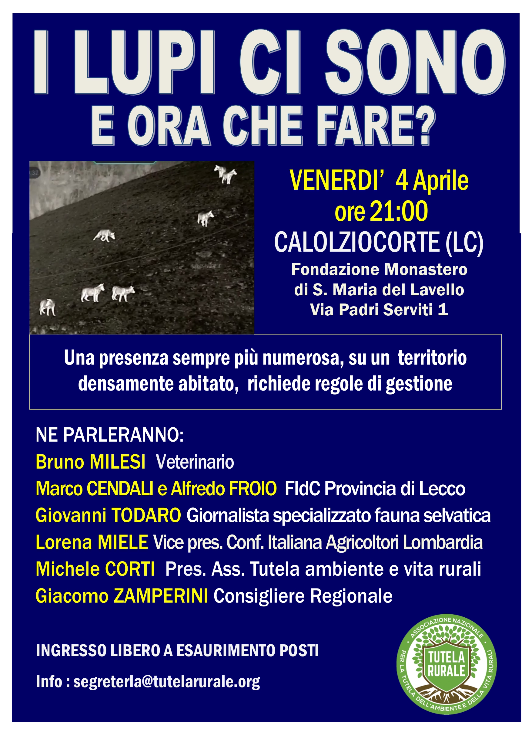 Venerdì 4 Aprile alle 21.00 a Calolziocorte, presso la Fondazione Monastero di S. Maria del Lavello, diversi esperti affronteranno il tema dei lupi che popolano le valli lecchesi. Ne parleranno il veterinario Bruno Milesi, il giornalista specializzato in fauna selvatica Giovanni Todaro, il consigliere regionale Giacomo Zamperini e molti altri. L’ingresso è libero fino a esaurimento posti.