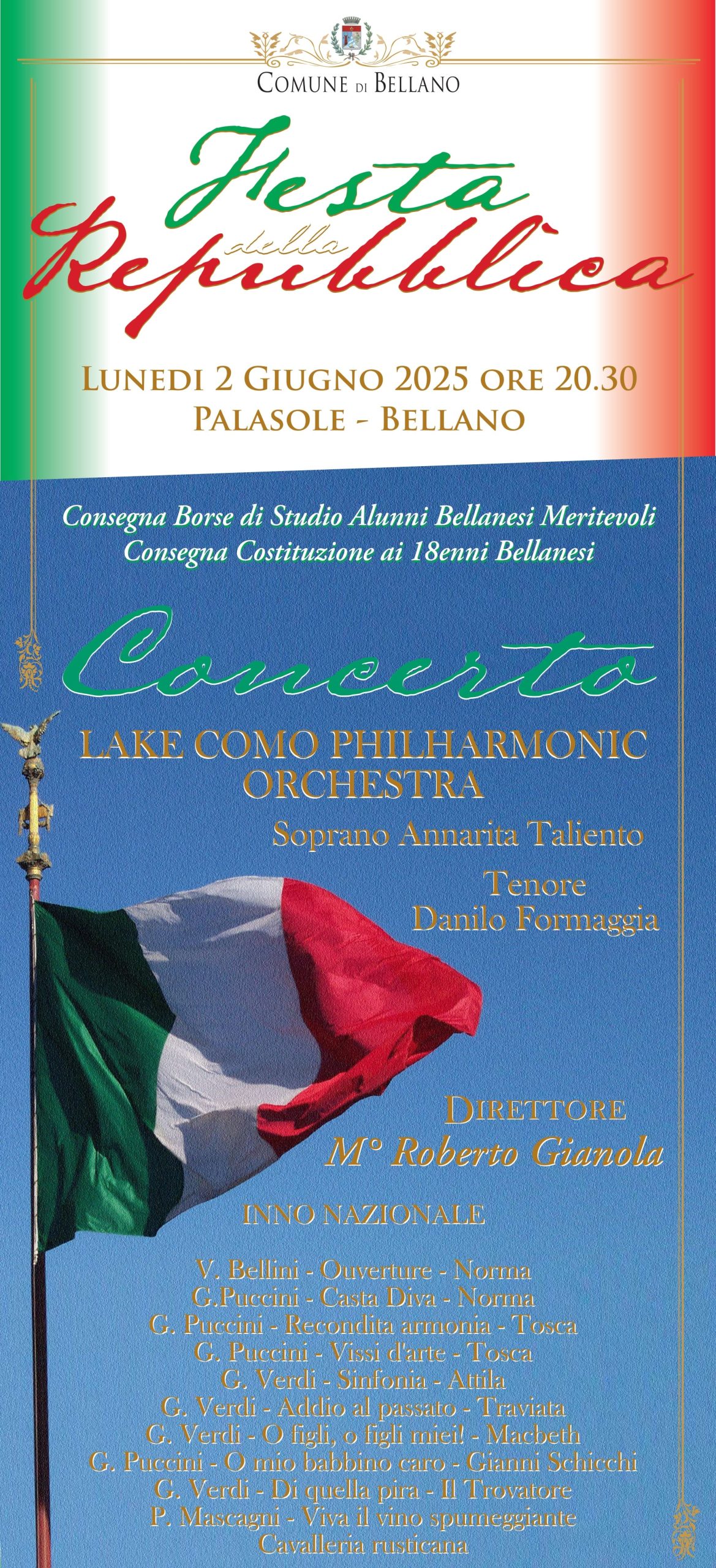 Il 2 Giugno, in occasione dell’anniversario della Festa della Repubblica, il Palasole di Bellano ospiterà il consueto concerto sinfonico. L’evento inizierà alle 20.30 e vedrà esibirsi la Lake Como Philarmonic Orchestra, guidata dal Maestro Roberto Gianola, il quale accompagnerà anche le voci di Tenore e Soprano di Danilo Formaggia e Annarita Taliento. Durante l’evento verranno anche consegnate le borse di studio agli studenti meritevoli, oltre che la costituzione a tutti i neo diciottenni.