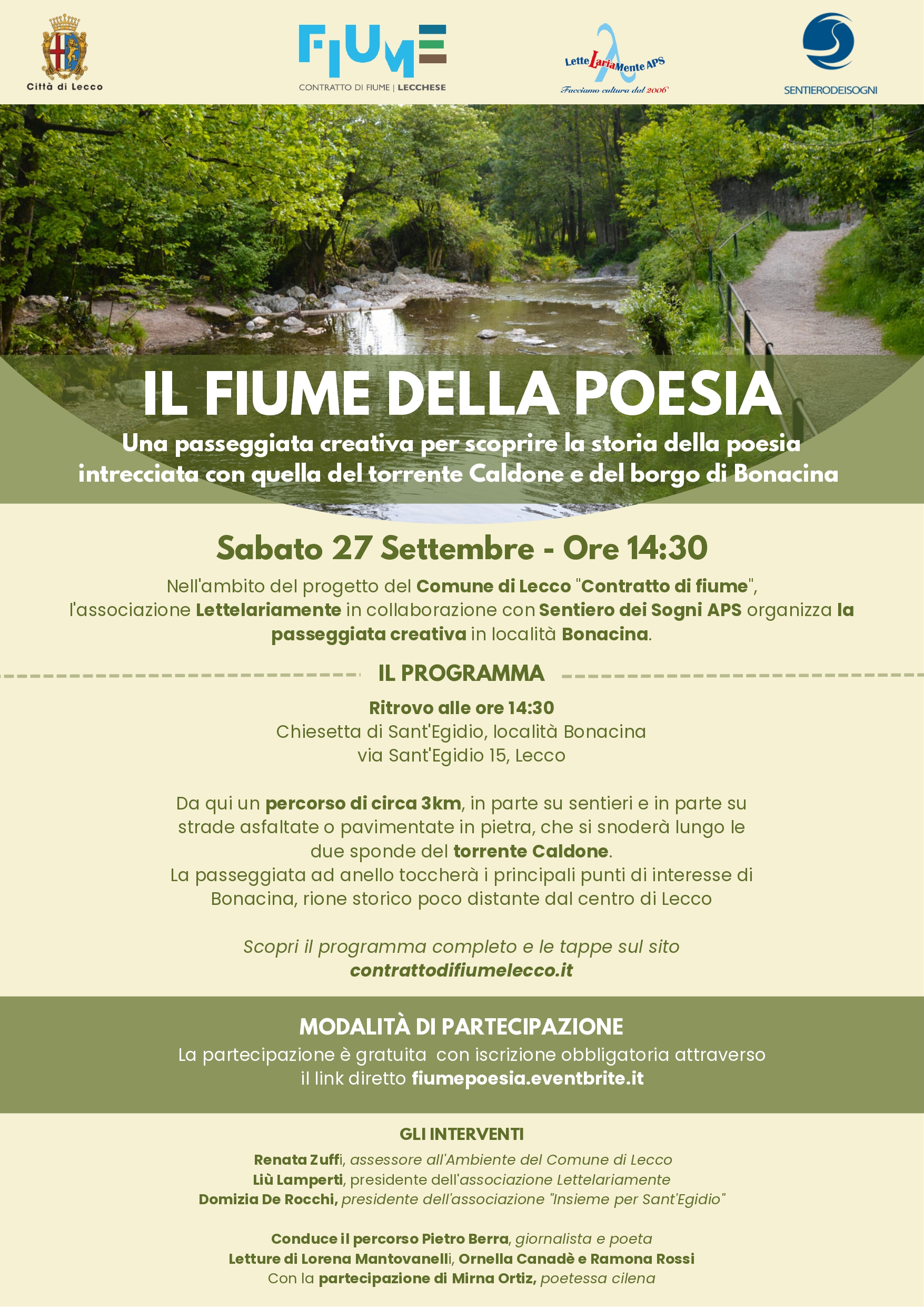 Sabato 27 settembre si terrà la camminata Il Fiume della Poesia: una passeggiata creativa per scoprire la storia della della poesia intrecciata con quella del torrente Caldone e del borgo di Bonacina. Il ritrovo è fissato per le 14.30 presso la Chiesa di Sant’Egidio, in Località Bonacina. La partecipazione è gratuita, ma è necessaria la prenotazione a questo link.