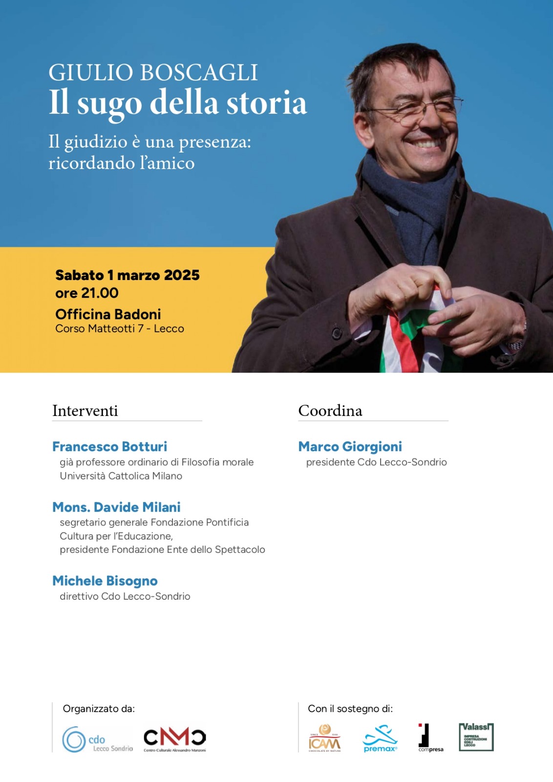 Sabato 1 marzo alle 21:00, presso l’Officina Badoni si terrà un incontro dal titolo: “Il sugo della storia – Il giudizio è una presenza: ricordando l’amico”, dedicato alla memoria di Giulio Boscagli.